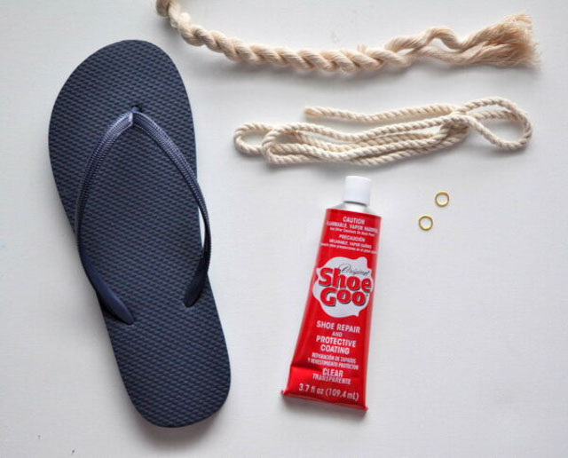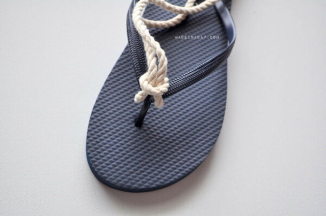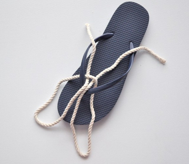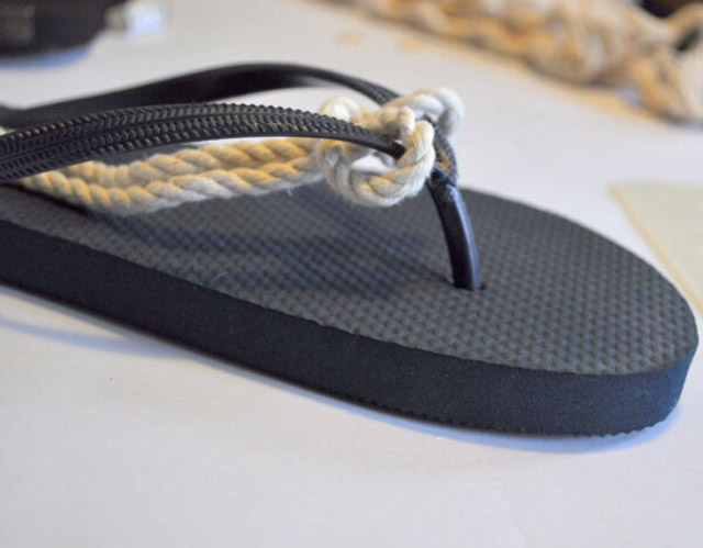 4. ค่อย ๆ ติดเชือกเข้ากับรองเท้าด้วยกาวให้แน่น