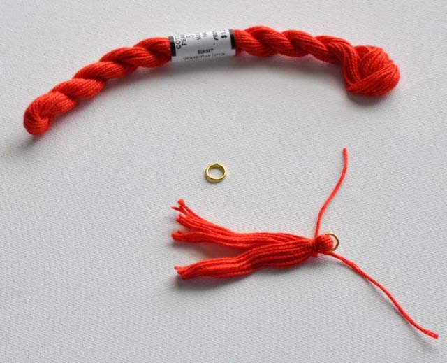 6. นำไหมมามัดให้เป็นพู่ตามขนาดที่เพื่อน ๆ ต้องการ และนำไปติดเข้ากับห่วงอันจิ๋วค่ะ