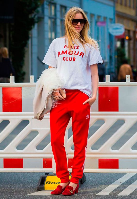 3. กางเกง “สีแดง” กับเสื้อยืดสีขาวคือความพอดีที่ลงตัวน่ามอง