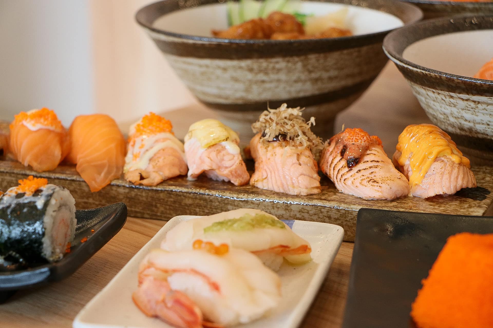 เมนูขายดี ที่แนะนำว่าต้องลอง! คือซูชิฟรัวกราส์ ซาชิมิปลาดิบรวม และ ยำแซลมอน หรือจะเป็นเมนูน้องใหม่ กุ้งหวานท๊อปฟรัวกราส์ ก็อร่อยเต็มปากเต็มคำสุดๆ
