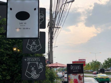 มาถึงร้านสุดท้ายมีชื่อว่า “Say Hi Cafe” ค่ะ ร้านนี้ตั้งอยู่ที่ สะพานพระราม 5 จ.นนทบุรี ถ้ามาจากฝั่งงามวงวานค์ข้ามสะพานพระราม 5 ร้านจะอยู่ซ้ายมือริมถนนเลยค่ะ หน้าร้านแต่งโทรสีดำ-ขาว สามารถจอดรถได้ที่หน้าร้านเลยค่ะ เมื่อเปิดประตูเข้ามาจะเจอกับตุ๊กตาพี่หมีคอยต้อนรับอยู่ตามโต๊ะ ภายในร้านตกแต่งสไตล์โมเดิร์น เปิดทุกวัน ตั้งแต่เวลา 11:00 – 22:00 ค่ะ