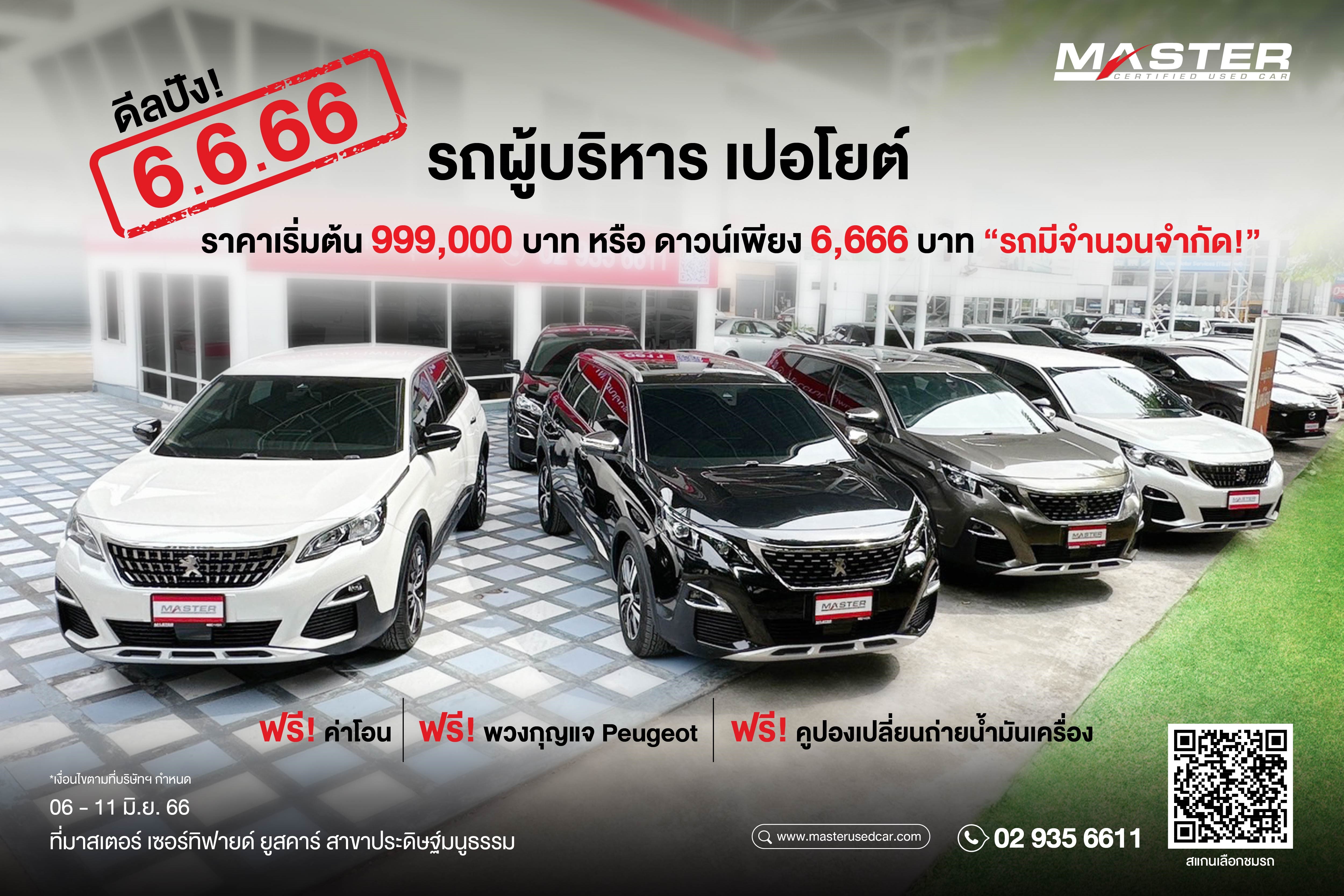 มาสเตอร์ฯ จัดดีลสุดปัง! ‘6.6.66’ ยกทัพรถผู้บริหาร PEUGEOT 5008 เริ่มต้น 999,000 บาท หรือดาวน์เพียง 6,666 บาท 6-11 มิถุนายนนี้ ที่โชว์รูม มาสเตอร์ เซอร์ทิฟายด์ ยูสคาร์ สาขาประดิษฐ์มนูธรรม