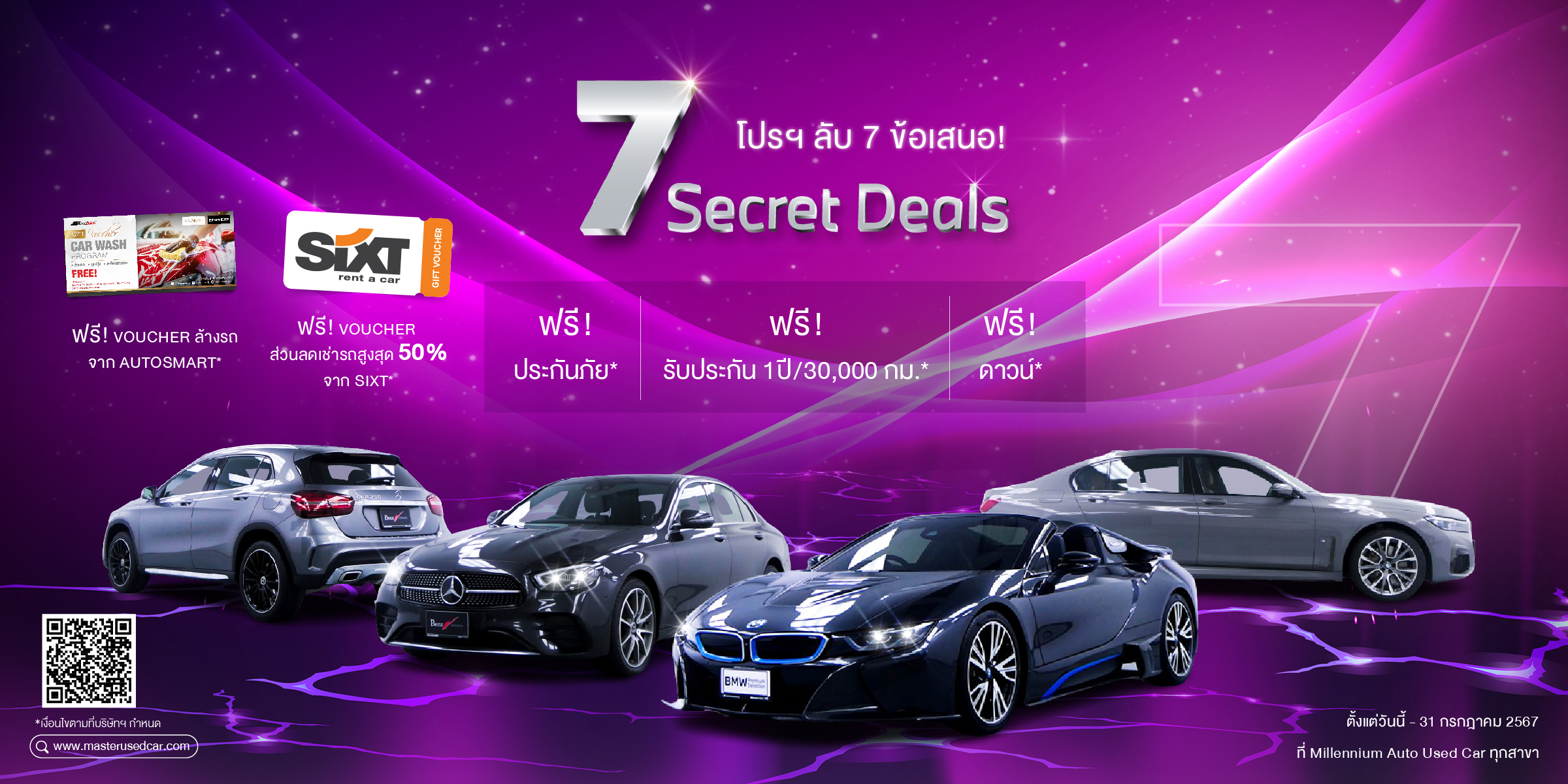 Master Certified Used Car มอบแคมเปญฉลองเดือนกรกฎาคม จัดโปรฯ ลับ! “7 Secret Deals” ยกทัพยนตรกรรมยุโรปมือสองสภาพดี ราคาคุ้มค่า มีให้เลือกกว่า 20 คัน คัดสรรมาให้ลูกค้าได้เลือกกว่า 20 คัน ตั้งแต่วันนี้ ถึง 31 กรกฎาคม 2567 ที่ โชว์รูม มิลเลนเนียม ออโต้ ยูสคาร์ ทุกสาขา