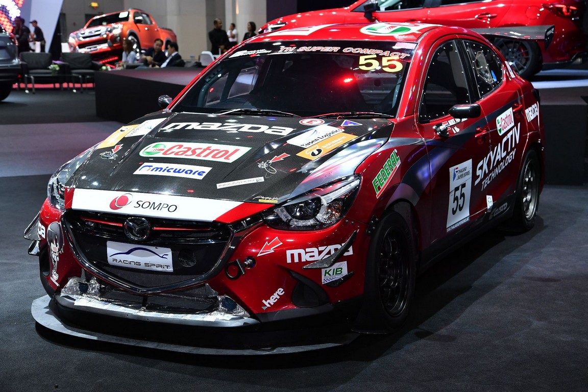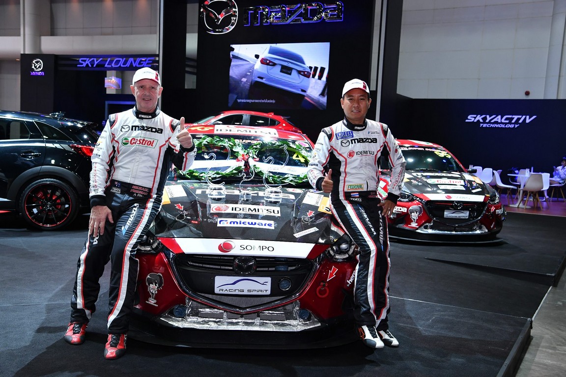 โดยมาสด้าชูคอนเซ็ปต์ความเป็นสปอร์ต ภายในบูธนำรถแข่งมาสด้า2 เครื่องยนต์คลีนดีเซล ขนาด 1500 ซีซี ทั้งรุ่นซีดานและรุ่นแฮทช์แบค ที่ลงวาดลวดลายแสดงแสนยานุภาพที่สนามบางแสน ด้วยการคว้าแชมป์มาครองในเรซที่ 3 และ 4 ในรายการไทยแลนด์ ซูเปอร์ ซีรี่ส์ 2017 รุ่น Thailand Super Compact ที่เพิ่งแข่งขันจบไปเมื่อสุดสัปดาห์ที่ผ่านมา โดยในปีนี้ได้นักแข่งฝีมือฉกาจอย่าง นายมานะ พรศิริเชิด มาร่วมทีม ขับประกบคู่กับนักแข่งมากประสบการณ์อย่าง นายไมเคิล ฟรีแมน ในนามทีม Mazda Innovation Motorsport และเป็นโอกาสดีที่จะได้ร่วมพูดคุยกับ มานะ ในฐานะนักแข่งของมาสด้าเป็นครั้งแรก รวมถึง ไมเคิล เกี่ยวกับการเตรียมความพร้อมในสนามถัดไป