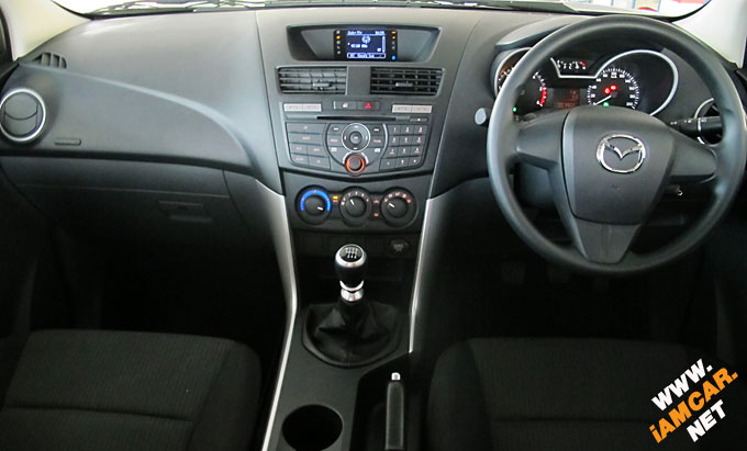 คราวนี้มาขับไป คุยไปและร่วมชื่นชมภายในกันดีกว่าครับ ห้องโดยสาร Mazda BT-50 Pro เน้นการออกแบบให้คล้ายกับรถนั่งให้มากที่สุด โดยคอนโซลหน้าเปิดกว้าง ในด้านคนนั่ง ทำให้ผู้โดยสารด้านหน้ารู้สึกสบาย และยังโอบกระชับทางด้านผู้ขับขี่เพื่อให้รู้สึกถึงความเป็นสปอร์ต โดยยังสามารถเลือกใช้งานอุปกรณ์ต่างๆ ได้ง่าย โทนสีโดยรวมเน้นที่สีดำดัดด้วยการตกแต่งขอบคิ้วสีเงิน