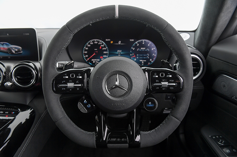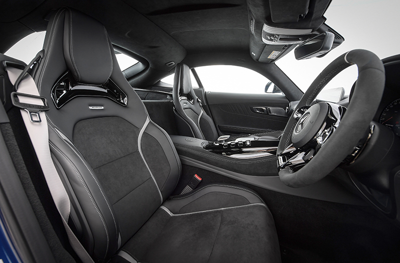 ด้านภายในห้องโดยสารได้รับการตกแต่งด้วยออพชั่น AMG Interior Piano Lacquer Package ผสานด้วยชุดออพชั่น AMG Interior Night Package เสริมด้วยความสปอร์ตเร้าใจ จากเบาะนั่งแบบ AMG Sport Bucket Seats หุ้มด้วยหนัง Nappa / DINAMICA Microfibre สีดำ, พวงมาลัยแบบ AMG Performance Steering Wheel หุ้มด้วย DINAMICA Microfibre สีดำ