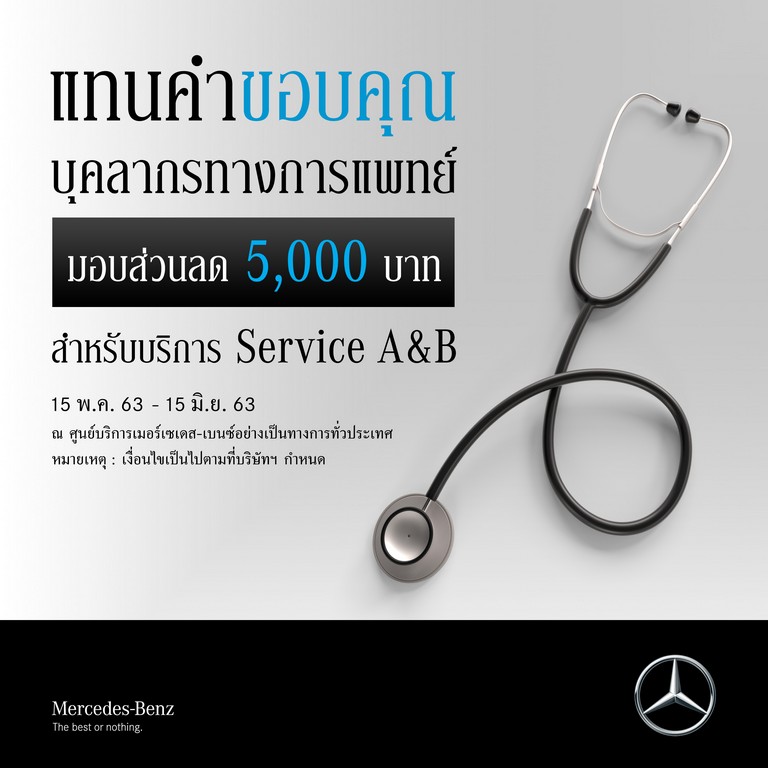 บริษัท เมอร์เซเดส-เบนซ์ (ประเทศไทย) จำกัด เล็งเห็นถึงความสำคัญและความทุ่มเทของบุคลากรทางการแพทย์เนื่องจากสถานการณ์การระบาดของเชื้อไวรัสโควิด-19 บริษัทฯ จึงขอเป็นส่วนหนึ่งในการสนับสนุนบุคลากรทางการแพทย์ ด้วยการมอบส่วนลด 5,000 บาทแทนคำขอบคุณ สำหรับการเข้ารับบริการบำรุงรักษารถยนต์เมอร์เซเดส-เบนซ์ Service A หรือ Service B ตั้งแต่วันที่ 15 พฤษภาคม – 15 มิถุนายน พ.ศ. 2563 ที่ศูนย์บริการเมอร์เซเดส-เบนซ์อย่างเป็นทางการทั่วประเทศ