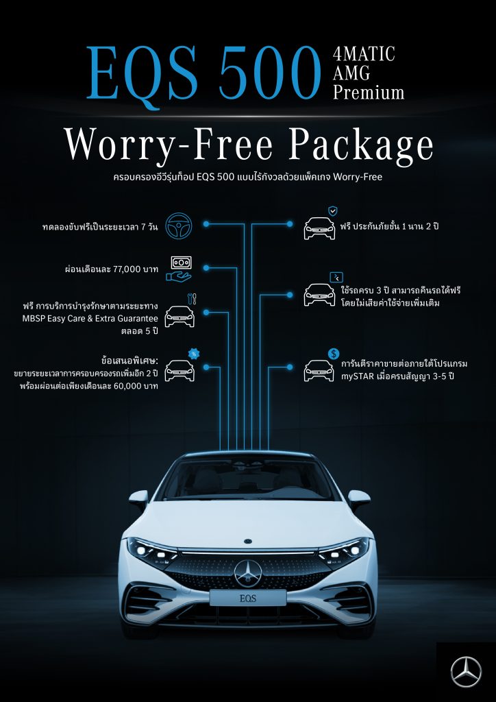 Mercedes-Benz Thailand ส่งแคมเปญเขย่าวงการยานยนต์ไฟฟ้าช่วงกลางปี มอบประสบการณ์อีกขั้นของการขับขี่หมดกังวลเรื่องค่าใช้จ่ายแอบแฝงด้วย “Worry-Free Package” แพ็กเกจสุดเอ็กซ์คลูซีฟ สำหรับรถยนต์รุ่น EQS 500 4MATIC AMG Premium โมเดลระดับ Top-End Luxury ของแบรนด์ที่มาพร้อมข้อเสนอพิเศษต่างๆ มากมาย ไม่ว่าจะเป็น การทดลองขับฟรี, นโยบายการเงิน, นโยบายการคืนรถ และประกันภัยชั้นหนึ่งจากเมอร์เซเดส-เบนซ์ นานถึง 2 ปี ตอบโจทย์ทุกไลฟ์สไตล์การใช้ชีวิต และการขับขี่ของคนยุคใหม่ พร้อมเปิดทางเลือกให้อย่างเต็มที่ตามที่ลูกค้าต้องการ