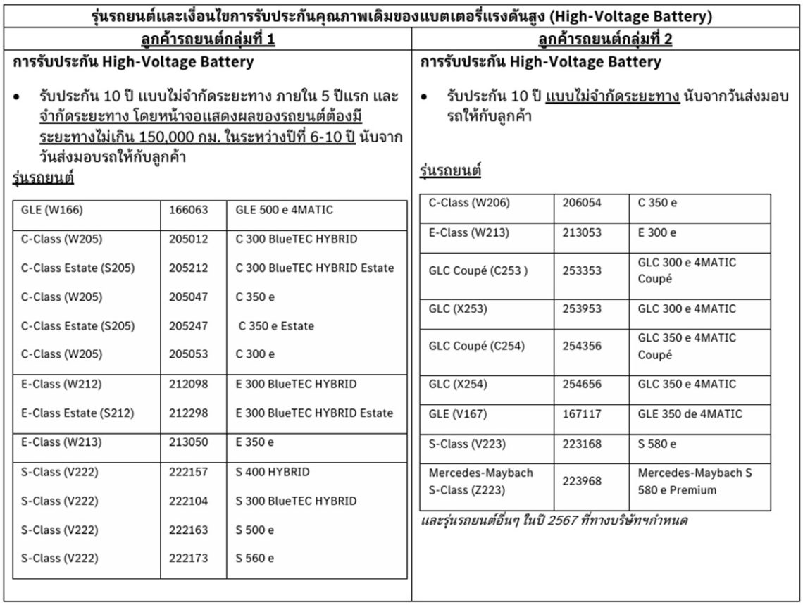 เมอร์เซเดส-เบนซ์ ประเทศไทย เห็นความสำคัญของประสิทธิภาพ และความมั่นใจในการใช้งานรถยนต์ เมอร์เซเดส-เบนซ์ ทุกคัน จึงได้จัดแคมเปญมอบสิทธิประโยชน์สำหรับลูกค้ารถยนต์ เมอร์เซเดส-เบนซ์ ในกลุ่ม Hybrid และ Plug-in Hybrid ที่มีอายุการใช้งานไม่เกิน 10 ปี และหลุดจากเงื่อนไขการรับประกันคุณภาพ High Voltage Battery ตามเงื่อนไขเดิม