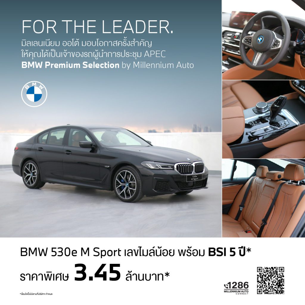 บีเอ็มดับเบิลยู มิลเลนเนียม ออโต้ ผู้จำหน่ายรถยนต์ บีเอ็มดับเบิลยู อย่างเป็นทางการ ยกทัพรถยนต์ป้ายแดง ไมล์น้อย บีเอ็มดับเบิลยู ซีรีส์ 5 ที่ใช้รองรับผู้นำจากนานาประเทศ ในการประชุมสุดยอดผู้นำอาเซียน (APEC) ประจำปี 2565 ที่ไทยเป็นเจ้าภาพ ให้ลูกค้าได้จับจองในจำนวนจำกัดเพียง 30 คัน กับราคาสุดคุ้มค่าเพียง 3.45 ล้านบาท พร้อมรับฟรี! BSI Ultimate นาน 5 ปี และชุดบำรุงรักษารถยนต์จาก บีเอ็มดับเบิลยู มิลเลนเนียม ออโต้