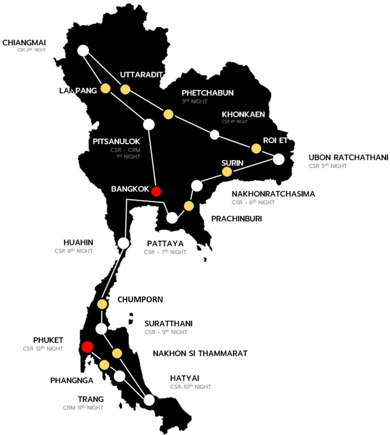 ครั้งนี้จึงมุ่งท่องไปยัง 60 จุดหมายทั่วไทย เน้นส่งเสริมการท่องเที่ยวเมืองรองบนเส้นทางที่ตามรอยประวัติศาสตร์และเยือนแลนด์มาร์คสำคัญ ครอบคลุม 20 จังหวัด ได้แก่ พิษณุโลก* ลำปาง* เชียงใหม่ อุตรดิตถ์* เพชรบุรี ขอนแก่น ร้อยเอ็ด* อุบลราชธานี* สุรินทร์* นครราชสีมา ปราจีนบุรี* ชลบุรี ประจวบคีรีขันธ์ ชุมพร* สุราษฏร์ธานี นครศรีธรรมราช สงขลา ตรัง พังงา และปิดท้ายที่ภูเก็ต รวมระยะทางทั้งหมด 3,160 กิโลเมตร โดยระหว่างทาง ผู้ร่วมทริปจะแชร์ภาพเรื่องราว แรงบันดาลใจ และมิตรภาพใหม่ๆ ผ่านแฮชแท็ก #MINIWANDERLUSTER บนโซเชียลมีเดียทั้งทาง Facebook, Instagram และ Twitter