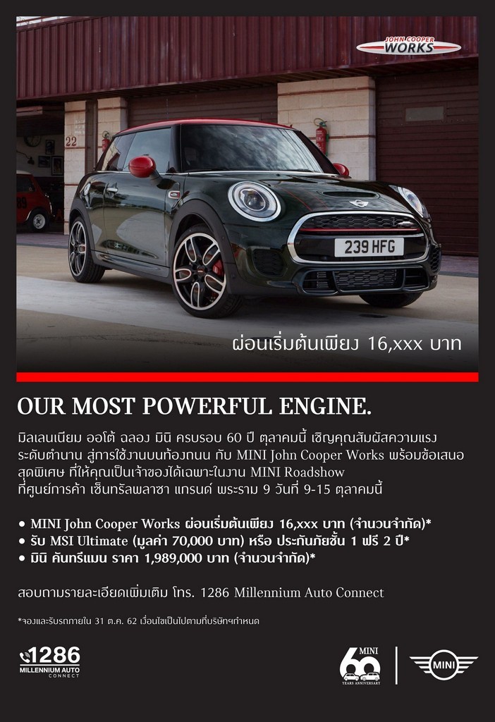 มินิ มิลเลนเนียม ออโต้ หนึ่งในผู้จำหน่ายรถยนต์ มินิ อย่างเป็นทางการในประเทศไทย เฉลิมฉลองครบรอบ 60 ปี ของรถยนต์ มินิ จัดกิจกรรมพิเศษให้ลูกค้าและผู้สนใจได้สัมผัสขีดสุดแห่งความแรงของ มินิ จอห์น คูเปอร์ เวิร์คส์ แฮตช์ พร้อมแคมเปญพิเศษ ‘Our Most Powerful Engine’ ระหว่างวันที่ 9-15 ตุลาคมนี้ ที่เซ็นทรัลพลาซา แกรนด์ พระราม 9 และโชว์รูม มินิ มิลเลนเนียม ออโต้ ทุกสาขา