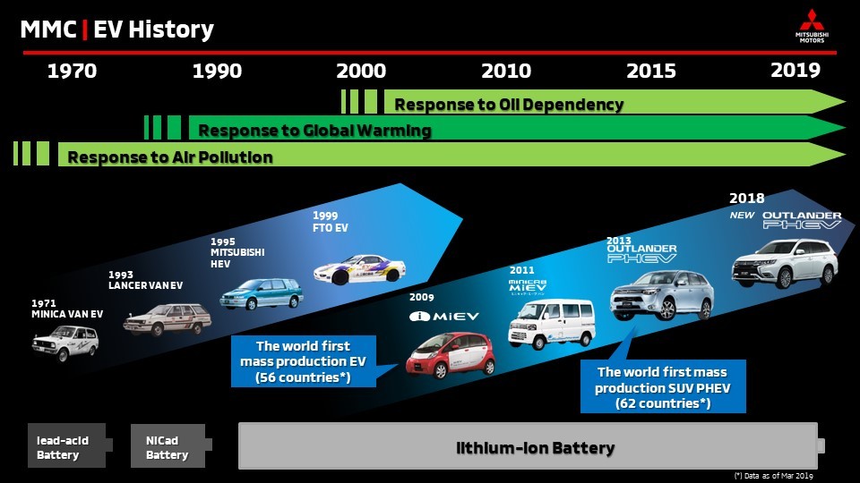 49 ปีหลังจากที่มิตซูบิชิสามารถผลิตรถยนต์เพื่อการจำหน่ายในเชิงพาณิชย์ได้เป็นครั้งแรกในประเทศญี่ปุ่นเมื่อปี 2460 มิตซูบิชิ ตระหนักว่าเชื้อเพลิงจากฟอสซิลมีปริมาณที่จำกัด อีกทั้งยังก่อให้เกิดผลกระทบต่อสิ่งแวดล้อม รวมไปถึงปัญหามลพิษในเมือง มิตซูบิชิจึงเริ่มคิดค้นที่จะใช้พลังงานในรูปแบบอื่นๆ ที่มีความยั่งยืนกว่า จึงได้เริ่มทำการวิจัยและพัฒนาการผลิตรถยนต์พลังงานไฟฟ้าหรือรถอีวี เพื่อจำหน่ายให้กับผู้บริโภค