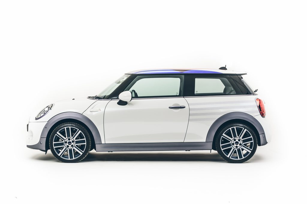 ไฮไลท์ที่สำคัญของมินิ แฮทช์ รุ่นพิเศษนี้ คือการรังสรรค์ลวดลายกราฟฟิคอันเป็นเอกลักษณ์บนหลังคารถ ซึ่งได้รับการวาดขึ้นด้วยมือและเป็นการผสานองค์ประกอบต่างๆ ของธงชาติสหราชอาณาจักรและธงชาติสหรัฐอเมริกา ประเทศบ้านเกิดของเจ้าชายแฮรี่และมิสเมแกน มาร์เคิล ไว้ด้วยกันอย่างลงตัว และอีกหนึ่งความพิเศษ คือกรอบไฟเลี้ยวด้านข้าง ที่พิมพ์ด้วยเครื่องพิมพ์สามมิติ จารึกอักษรย่อตัว M และ H พร้อมลายหัวใจ เมื่อเปิดประตูรถ ไฟใต้กรอบประตูสาดส่องต้อนรับเป็นคำว่า “Just Married” บริเวณพื้นด้านคนขับและผู้โดยสารด้านหน้า เป็นสักขีพยานรักในพิธีเสกสมรสครั้งประวัติศาสตร์นี้