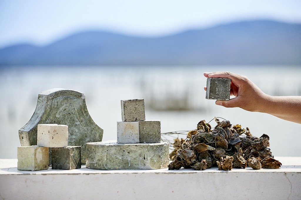 อิฐบล๊อกและอิฐปูทางเดินเรืองแสงที่มีส่วนผสมจากเปลือกหอยนางรมในชุมชน