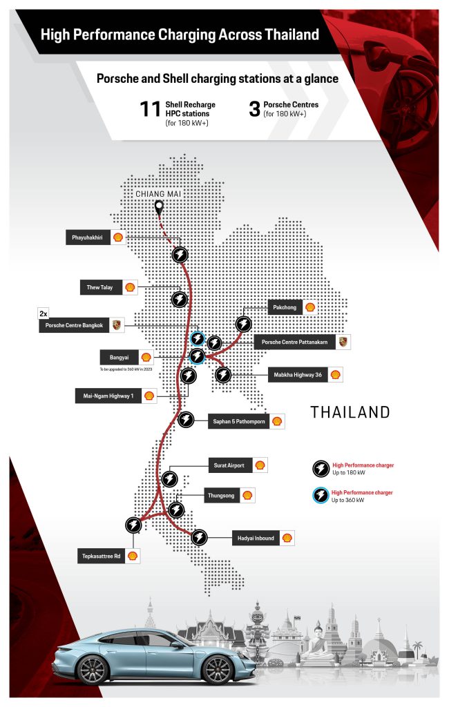 ด้วยความร่วมมือดังกล่าว สถานีบริการ Shell จำนวน 11 แห่งในประเทศไทย จะได้รับการติดตั้งจุดชาร์จพลังงานไฟฟ้า DC chargers ขนาด 180 กิโลวัตต์ และ 360 กิโลวัตต์ สำหรับรองรับระบบการชาร์จประสิทธิภาพสูงในประเทศไทย ให้ผู้ขับขี่สามารถเดินทางที่ไร้ซึ่งมลพิษจากจังหวัดสงขลาในเขตภาคใต้ จนถึงจังหวัดเชียงใหม่ในเขตภาคเหนือ เมื่อใช้งานระบบชาร์จขนาด 180 กิโลวัตต์ ปอร์เช่ ไทคานน์ (Taycan) สามารถชาร์จพลังงานจาก 0% State of Charge (SoC) ถึงระดับ 80% ภายในเวลาประมาณ 30 นาที เดินทางได้สูงสุดถึง 390 กิโลเมตร (ทดสอบตามมาตรฐาน WLTP) ในส่วนของการใช้งานระบบชาร์จขนาด 270 กิโลวัตต์ อันเป็นกำลังสูงสุดที่ปอร์เช่ ไทคานน์ (Taycan) สามารถรองรับได้นั้น จะใช้เวลาลดลงเหลือเพียง 22 นาทีเท่านั้น