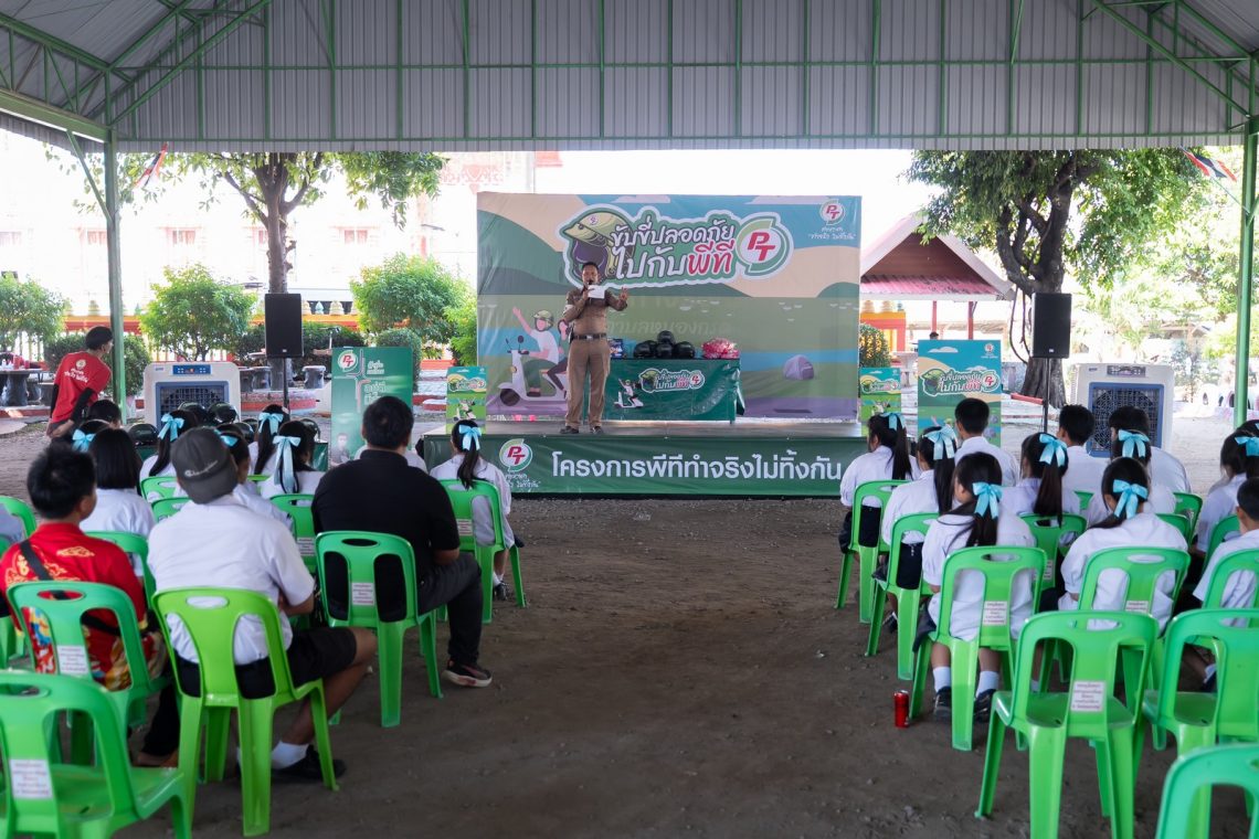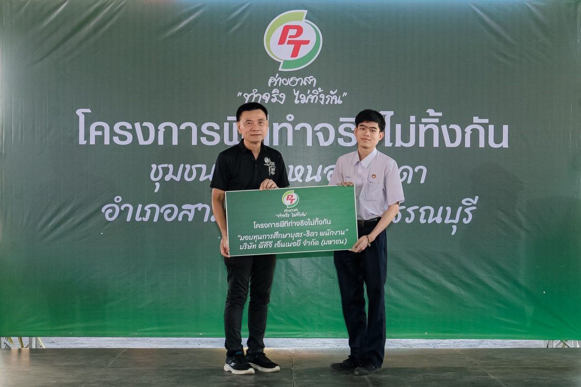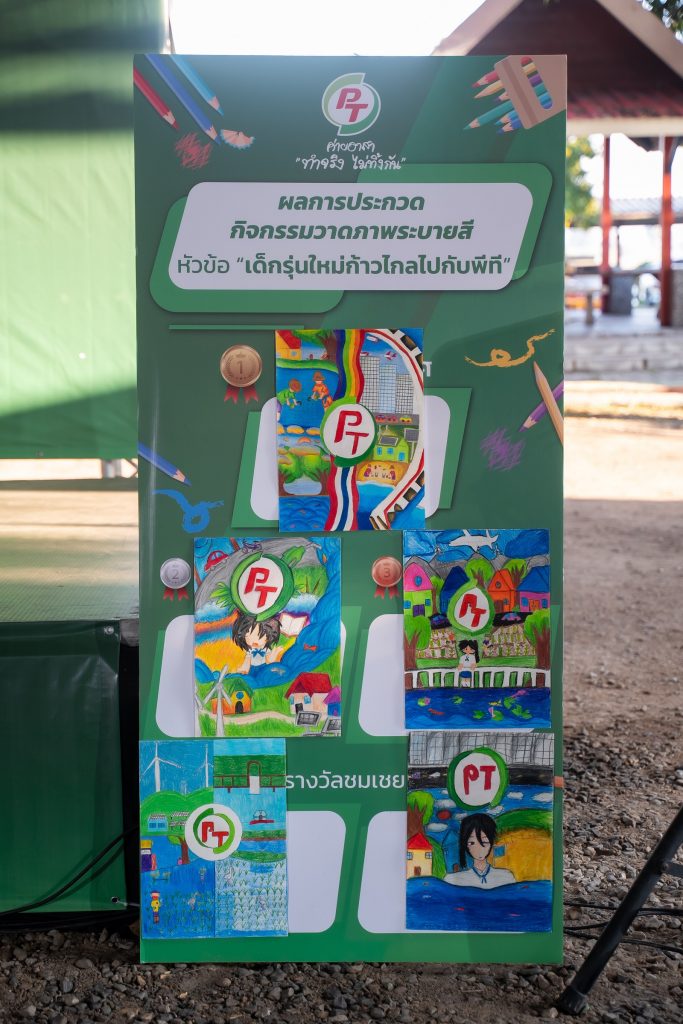 - ด้านการศึกษาและเยาวชน: มอบทุนการศึกษาสำหรับนักเรียนเรียนดีแต่ขาดแคลนทุนทรัพย์ ที่อยู่ในพื้นที่ชุมชนนี้ ทั้ง 6 สถานศึกษา จำนวน 42 ทุน ทุนละ 2,000 บาท พร้อมมอบทุนการ ศึกษาบุตรและธิดาของพนักงานเรียนดี แต่ขาดแคลนทุนทรัพย์ อีกจำนวน 10 ทุน ทุนละ 2,000 บาท รวมถึงสนับสนุนอุปกรณ์การเรียน อุปกรณ์กีฬา มอบพันธุ์ผักสวนครัวสำหรับประกอบอาหารกลางวัน และปรับปรุงสนามเปตอง นอกจากนี้ยังมีการจัดประกวดวาดภาพระบายสีหัวข้อ “ชุมชนรุ่นใหม่ ก้าวไกลไปกับ พีที” เพื่อเปิดพื้นที่ความคิดสร้างสรรค์ให้กับเยาวชน และยังมีกิจกรรมเสริมทักษะจากกลุ่มอาสาสมัคร Gen Z มหาวิทยาลัยราชภัฏวไลยอลงกรณ์ ในพระบรมราชูปถัมภ์ มาร่วมกิจกรรม “PT พี่อาสา สอนน้องเรียน พาน้องเล่น PT Gen Z English Fun” และมหาวิทยาลัยสวนดุสิต วิทยาเขตสุพรรณบุรี มาร่วมสร้างสีสัน กับกิจกรรม PT Gen Z Music Concert