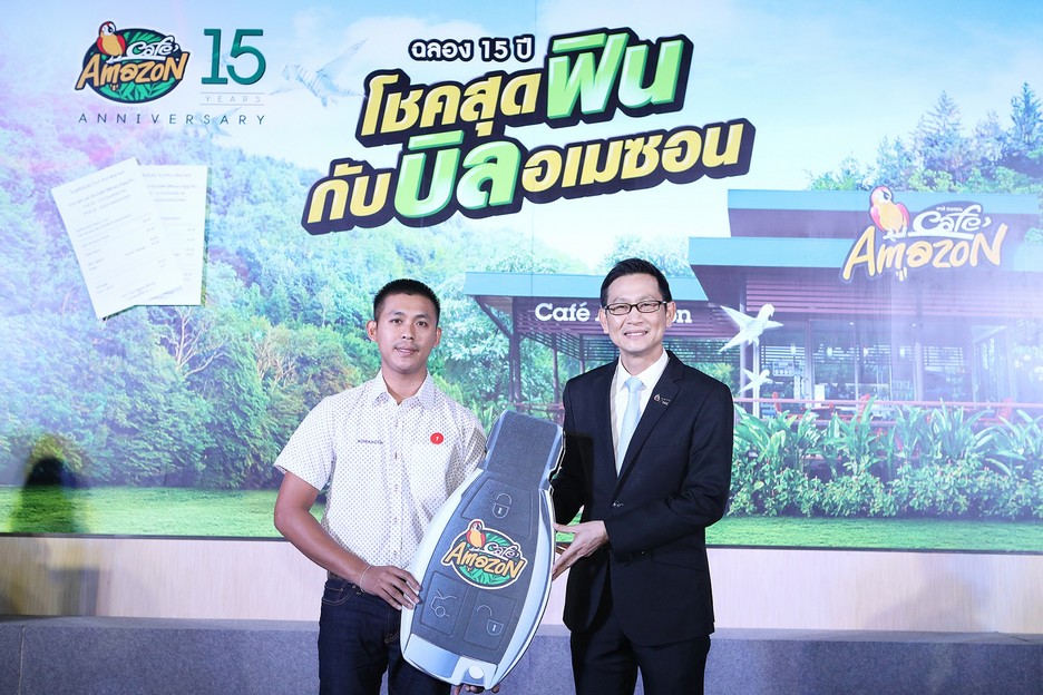 นายอรรถพล ฤกษ์พิบูลย์ ประธานเจ้าหน้าที่ปฏิบัติการกลุ่มธุรกิจปิโตรเลียมขั้นปลาย บริษัท ปตท. จำกัด (มหาชน) เป็นประธานในพิธีมอบรางวัลแก่ผู้โชคดีกับกิจกรรม “โชคสุดฟินกับบิลอเมซอน” ฉลองครบรอบ 15 ปี ซึ่งจัดขึ้นระหว่างวันที่ 15 มิถุนายน ถึง 15 กันยายน 2560 ที่ผ่านมา ณ อาคารสำนักงานใหญ่ ปตท. โดยมอบรางวัลที่ 1 รถยนต์ Mercedes-Benz รุ่น C350 e Plug – in Hybrid 1 รางวัล และรางวัลรองอีกรวมทั้งสิ้น 121 รางวัล มูลค่า 6,772,000 ล้านบาท แทนคำขอบคุณที่ผู้บริโภคไว้วางใจใช้บริการร้านคาเฟ่ อเมซอนด้วยดีเสมอมา