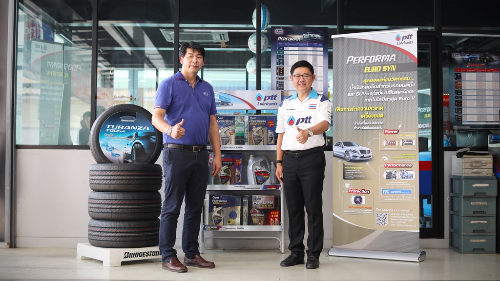 นายบุรณิน รัตนสมบัติ ผู้ช่วยกรรมการผู้จัดการใหญ่ธุรกิจหล่อลื่น บริษัท ปตท. จำกัด (มหาชน) กับนายธนวัฒน กิตติรัตนาภรณ์ กรรมการผู้จัดการ บริษัท บริดจสโตน เอ.ซี.ที (ประเทศไทย) จำกัด