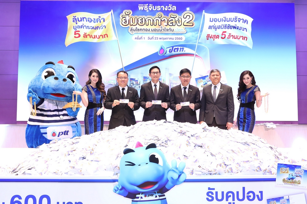 คุณอรรถพล ฤกษ์พิบูลย์ รองกรรมการผู้จัดการใหญ่หน่วยธุรกิจน้ำมัน บริษัท ปตท. จำกัด (มหาชน) เป็นประธานในพิธีจับรางวัลกิจกรรมส่งเสริมการขาย “ ยิ้มยกกำลังสอง ” ครั้งที่ 1 ณ อาคารสำนักงานใหญ่ ปตท. โดยมีคณะผู้บริหารร่วมมอบโชคทองคำแท่งหนัก 10 บาท จำนวน 3 รางวัล และสร้อยคอทองคำหนัก 1 บาท จำนวน 30 รางวัล รวมมูลค่ากว่า 1,200,000 บาท พร้อมเชิญชวนผู้บริโภคร่วมลุ้นรางวัลใหญ่ ทองคำหนัก 50 บาทและรางวัลอื่นๆ เพิ่มเติมอีกในการจับรางวัลครั้งที่ 2 จนถึงวันที่ 30 มิถุนายนนี้