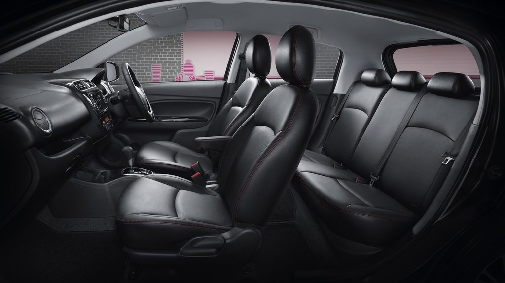 ภายในห้องโดยสารของ มิตซูบิชิ มิราจ ลิมิเต็ด อิดิชั่น ได้รับการตกแต่งสุดพิเศษ ทั้งหัวเกียร์หุ้มหนังพร้อมเดินตะเข็บด้ายสีแดง การตกแต่งด้วยวัสดุสีดำเปียโนแบล็คและโครเมียมบนพวงมาลัยหุ้มหนังพร้อมด้ายแดง พร้อมเติมบรรยากาศความสปอร์ตด้วยเบาะที่นั่งแบบสปอร์ตหุ้มผ้าทูโทนสีดำ-แดง พร้อมด้ายแดงเดินตะเข็บคู่