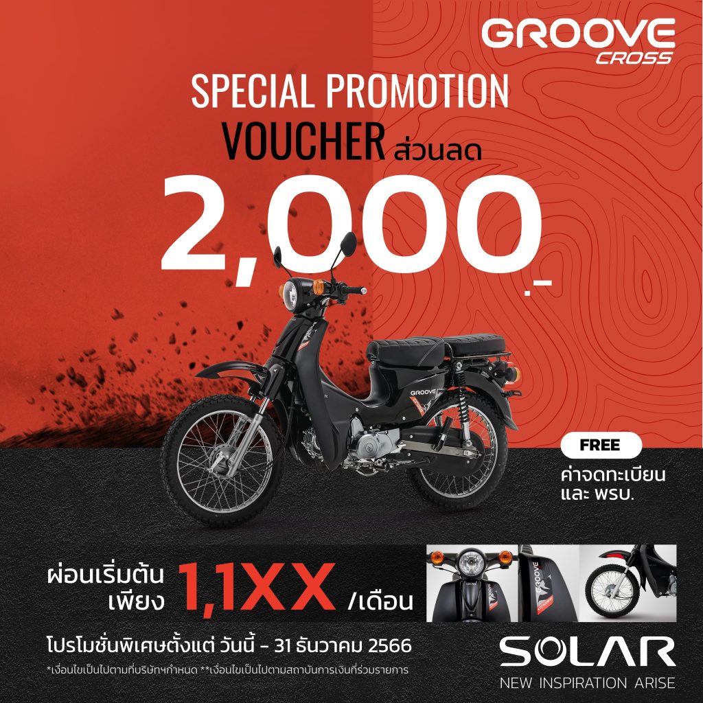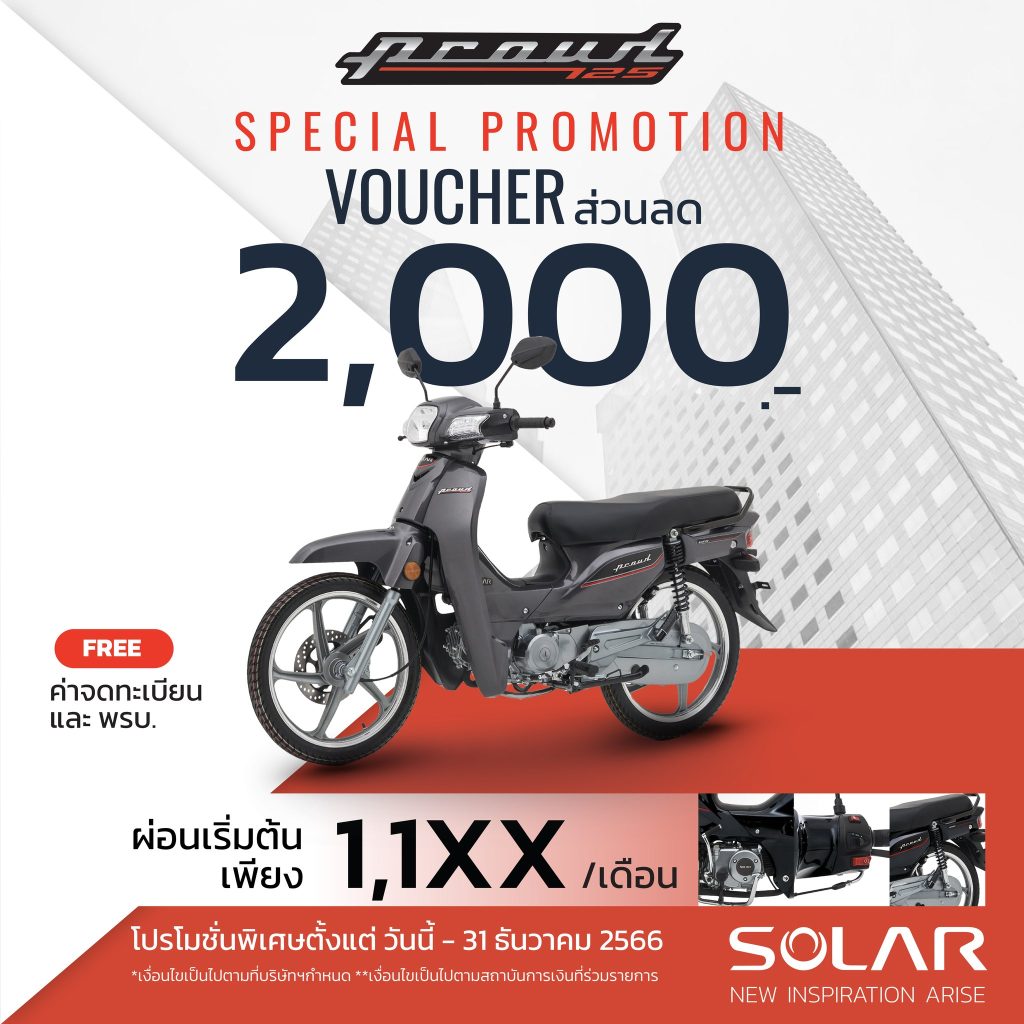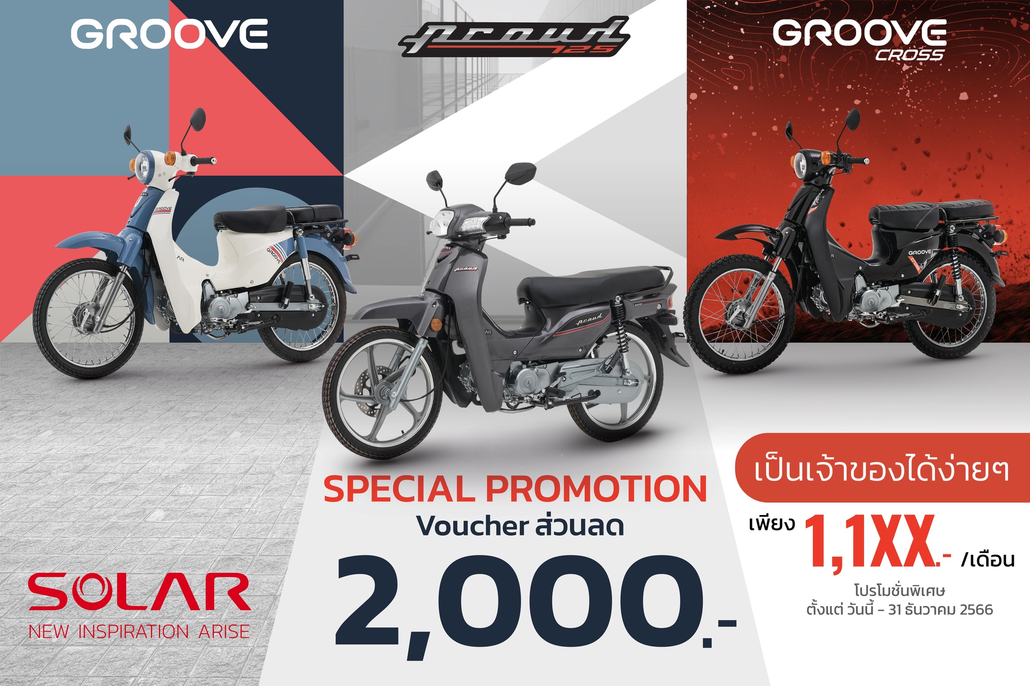 SOLAR มาพร้อมคอนเซ็ปต์ “NEW INSPIRATION ARISE” กำเนิดใหม่ของแรงบันดาลใจ เสมือนแสงอาทิตย์แรกของทุกวันที่สะท้อนให้เกิดพลังขับเคลื่อนยานยนต์สองล้อสไตล์ใหม่ ที่มีมาให้เลือกถึง 3 สไตล์ด้วยกัน ไม่ว่าจะเป็น PROUD, GROOVE URBAN และ GROOVE CROSS ด้วยคาแรคเตอร์ที่ชัดเจน ดีไซน์โดดเด่น ตอบโจทย์ไลฟ์สไตล์ที่ไม่เหมือนใคร มาร่วมค้นหาแรงบันดาลใจใหม่ด้วยข้อเสนอสุดพิเศษ ทุกรุ่น ทุกสไตล์ รับทันที VOUCHER ส่วนลด 2,000 บาท ฟรี!!! ค่าจดทะเบียน พรบ. และผ่อนเริ่มต้นเพียง 1,1XX บาท/เดือน เท่านั้น ตั้งแต่วันนี้จนถึง 31 ธันวาคม 2566