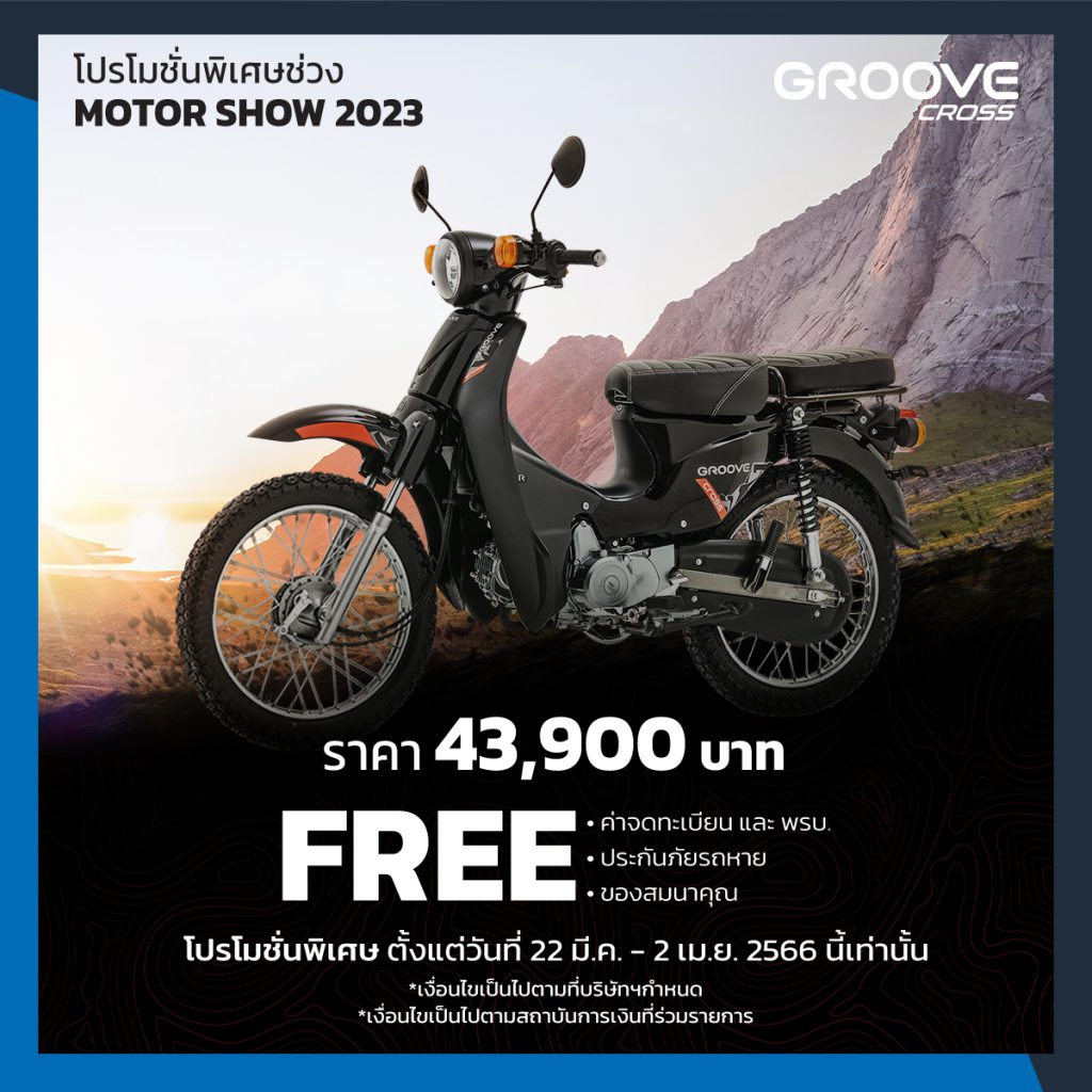 - GROOVE CROSS 125 : ได้เวลาออกนอกเส้นทาง…พร้อมที่จะเปลี่ยนรูปแบบการเดินทางแบบเดิมๆให้แตกต่าง ด้วยดีไซน์ตกแต่งพิเศษ ดุดันสายลุยตัวจริง มาพร้อมฟังก์ชั่นที่ตอบโจทย์ผู้ชื่นชอบการเดินทางด้วยโช้คอัพยกสูง ราคาสุดพิเศษที่ 43,900 บาท ฟรี!!! ค่าจดทะเบียน พรบ.และประกันรถหาย พร้อมของสมนาคุณ