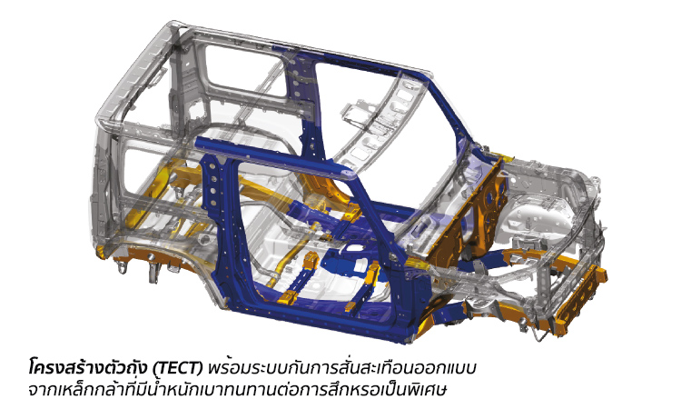 ระบบ Traction Control System ช่วยป้องกันล้อหมุนฟรีและช่วยควบคุมรถให้มีเสถียรภาพขณะขับบนถนนลื่นหรือทางโค้ง โครงสร้างตัวถัง TECT ออกแบบจากเหล็กกล้า ทนทานต่อการสึกหรอเป็นพิเศษ พร้อมระบบกันการสั่นสะเทือน
