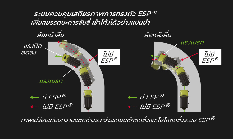 ปลอดภัยด้วยถุงลมนิรภัยคู่หน้า SRS ระบบเบรก ABS พร้อมระบบกระจายแรงเบรกอิเล็กทรอนิกส์ EBD ระบบควบคุมเสถียรภาพขณะขับบนถนนลื่นหรือทางโค้ง ESP ระบบช่วยป้องกันรถไหลพร้อมช่วยออกตัวและชะลอความเร็วขณะอยู่บนทางลาดชัน Hill Hold Control และ ระบบ Hill Descent Control ช่วยชะลอความเร็วขณะลงทางลาดชัน