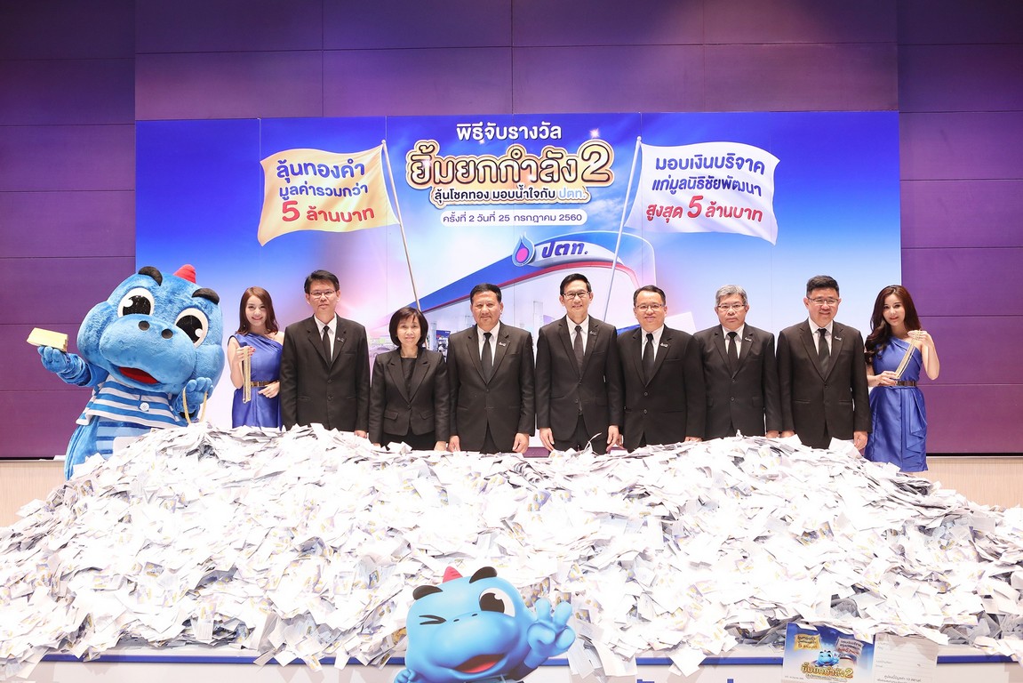 ปตท. ร่วมจับรางวัลกิจกรรมส่งเสริมการขาย “ยิ้มยกกำลังสอง” ครั้งที่ 2 ณ อาคารสำนักงานใหญ่ ปตท. มอบโชคทองคำแท่ง หนัก 50 บาท จำนวน 1 รางวัล ทองคำแท่ง หนัก 10 บาท จำนวน 7 รางวัล และสร้อยคอทองคำหนัก 1 บาท จำนวน 70 รางวัล รวมมูลค่า 3,916,200 บาท