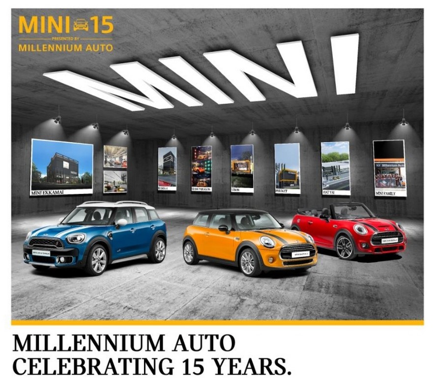 ‘มิลเลนเนียม ออโต้ มินิ‘ ตอกย้ำความสำเร็จ จัดงานฉลองครบรอบ 15 ปี แจกไมล์จากการบินไทย (ROP) สูงสุดถึง 70,000 ไมล์ เมื่อนำรถมินิมาเทรด-อิน พร้อมมอบโปรโมชั่นพิเศษ AIS CAR WIFI พิเศษสุด! ซื้อคันทรีแมนโฉมใหม่ ผ่อนเริ่มต้นเพียง 15,000 บาท