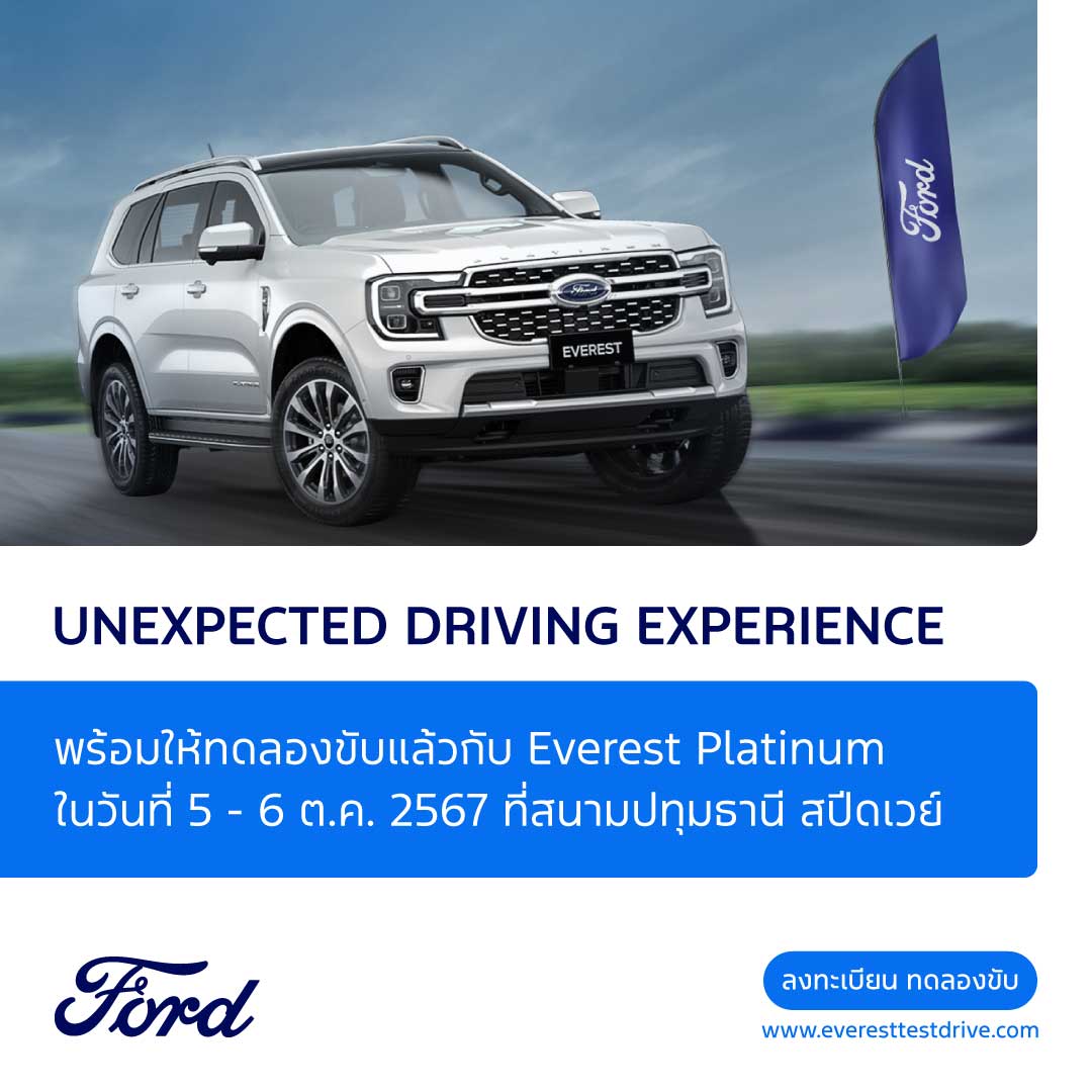 ฟอร์ด ประเทศไทย เดินหน้าต่อยอดความสำเร็จจากเสียงตอบรับที่ดีเยี่ยมจากลูกค้า ประกาศเปิดรับจอง Ford Everest Platinum ขุมพลังเครื่องยนต์ดีเซล 3.0 ลิตร V6 ล็อตใหม่ ไม่จำกัดจำนวนราคาเดิม 2,279,000 บาท เปิดจองพร้อมกันทั่วประเทศในวันที่ 17 กันยายน 2567 เวลา 10:00 น. เป็นต้นไป ผ่านช่องทางออนไลน์ www.ford.co.th พร้อมเชิญชวนผู้ที่สนใจร่วมสัมผัสประสบการณ์การขับขี่ที่จะทำให้คุณรู้สึกถึงความ ‘กล้าทุกความท้าทาย’ ในกิจกรรม ‘The Unexpected Driving Experience’ วั…