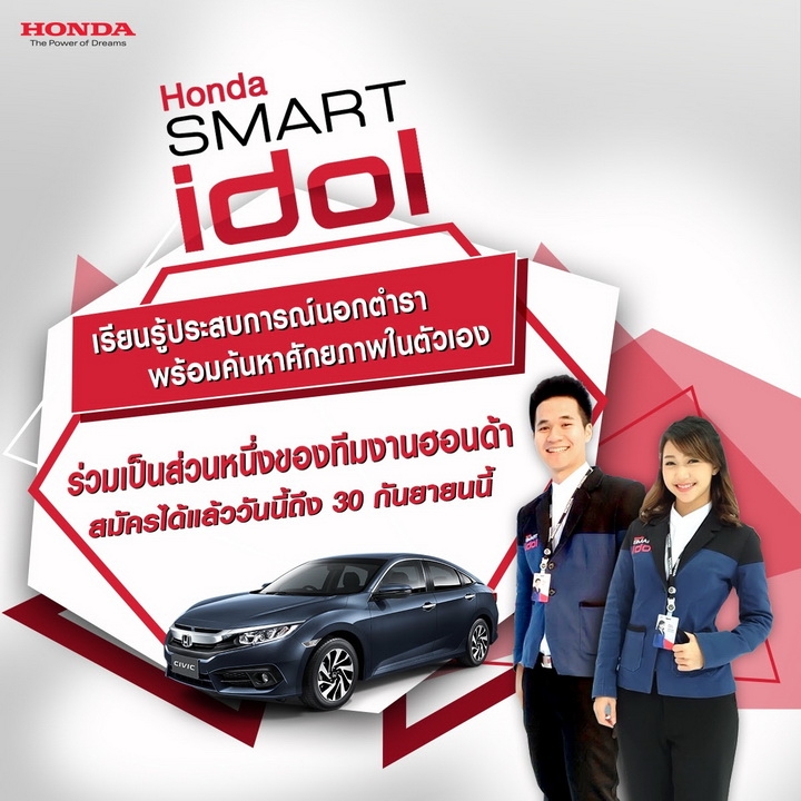 บริษัท ฮอนด้า ออโตโมบิล (ประเทศไทย) จำกัด เชิญชวนนิสิต นักศึกษา หนุ่มสาวคนรุ่นใหม่ ร่วมเรียนรู้ประสบการณ์การทำงานจริงกับฮอนด้า ผ่านโครงการ “Honda Smart Idol” ให้กับผู้เยี่ยมชมบูทแสดงรถยนต์ฮอนด้าในงาน Thailand International Motor Expo ครั้งที่ 34 และงาน Bangkok International Motor Show ครั้งที่ 39
