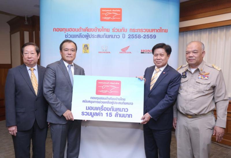 กองทุนฮอนด้าเคียงข้างไทย ภายใต้มูลนิธิฮอนด้าประเทศไทย สานต่อโครงการ “กองทุนฮอนด้าเคียงข้างไทย ร่วมกับกระทรวงมหาดไทย และกรมป้องกันและบรรเทาสาธารณภัย ช่วยเหลือผู้ประสบภัยหนาว ประจำปี 2558-2559” โดยส่งมอบเครื่องกันหนาว รวมมูลค่าทั้งสิ้น 15,090,000 บาท พร้อมเคลื่อนคาราวานส่งมอบความช่วยเหลือแก่ผู้ประสบภัยหนาวช่วงปลายปี ในเขตพื้นที่ภาคเหนือและภาคตะวันออกเฉียงเหนือ รวม 11 จังหวัด ระหว่างวันที่ 9 – 13 พฤศจิกายน 2558 นี้