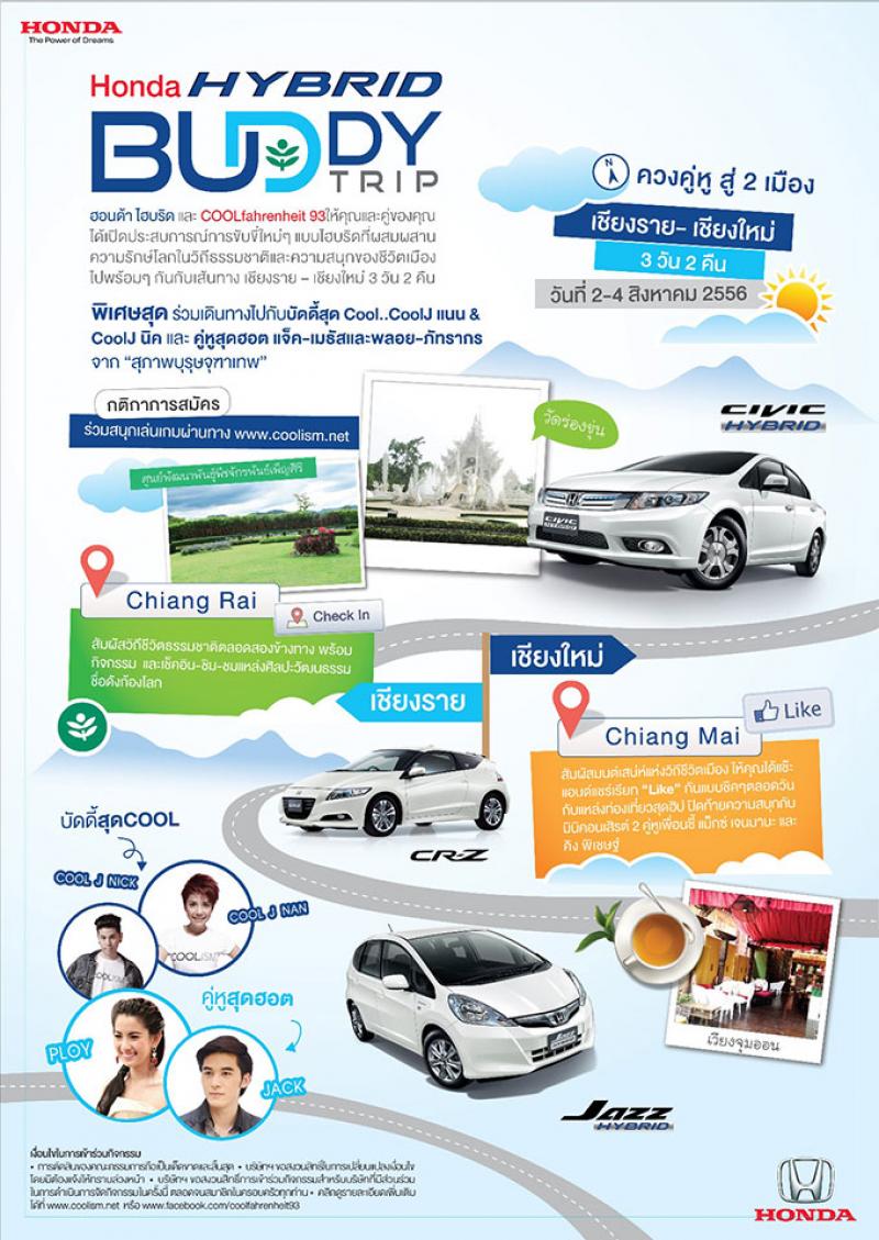 บริษัท ฮอนด้า ออโตโมบิล (ประเทศไทย) จำกัด ร่วมกับ คูลฟาเรนไฮต์ 93 จัดกิจกรรมสุดคูล Honda Hybrid Buddy Trip โดยจะเฟ้นหาผู้โชคดี 10 คู่ ร่วมเปิดประสบการณ์การขับขี่รถยนต์ฮอนด้าไฮบริดทั้ง 3 รุ่น ได้แก่ ซีวิค ไฮบริด แจ๊ซ ไฮบริด และซีอาร์ – ซีร์ สปอร์ตไฮบริด ที่ผสานการทำงานของเครื่องยนต์และมอเตอร์ไฟฟ้าได้อย่างลงตัว เน้นประสิทธิภาพความประหยัด แต่ยังคงเอกลักษณ์การขับขี่ที่สนุกสนาน