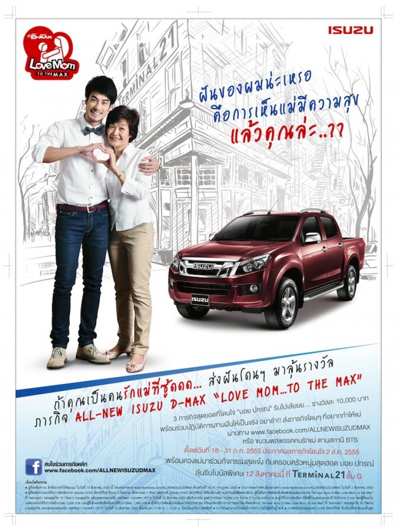 “บอย ปกรณ์” ชวนส่งภารกิจโดนๆ ที่อยากทำให้แม่ในวันแม่ปีนี้ กับกิจกรรมสุดเจ๋ง All-new Isuzu D-Max “LOVE MOM… TO THE MAX” รักแม่ที่ซู้ดดด 3 ภารกิจไหนโดนใจ หนุ่มสุดฮอต “บอย ปกรณ์” รับไปเลย รางวัลละ 10,000 บาท เพื่อร่วมปฏิบัติการสานฝันให้เป็นจริง พร้อมควงแม่มาร่วมกิจกรรมสุดเจ๋ง กับครอบครัว “ฉัตรบริรักษ์” ลุ้นรับโบนัสพิเศษในวันแม่ที่ 12 สิงหาคม 2555 ที่ Terminal 21 ชั้น G