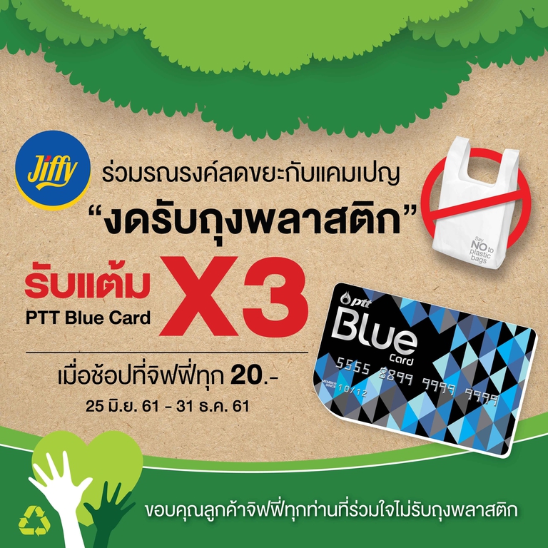 บริษัท ปตท. บริหารธุรกิจค้าปลีก จำกัด ผู้บริหารร้านสะดวกซื้อจิฟฟี่ขอร่วมเป็นส่วนหนึ่งในการรณรงค์ลดใช้ถุงพลาสติกด้วยการให้คะแนน PTT Blue Card คูณ 3 เท่า เมื่อซื้อสินค้าจิฟฟี่โดยไม่รับถุงพลาสติกที่จิฟฟี่ทั่วประเทศ เริ่มวันที่ 25 มิถุนายน จนถึง 31 ธันวาคม 2561 นี้