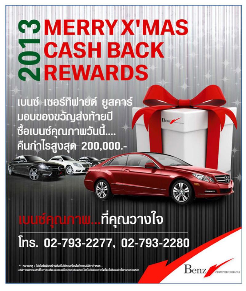 ร่วมฉลองเทศกาลคริสต์มาสและส่งท้ายปีเก่าต้อนรับปีใหม่ ระเบิดแคมเปญ “2013 MERRY X’MAS CASH BACK REWARD” ตั้งแต่วันนี้ถึง 25 ธ.ค.นี้ คืนเงินสดให้ทันทีสูงสุด 2 แสนบาท ไม่ต้องเสียเวลาลุ้นโชค ย้ำมีรถพร้อมส่งมอบให้เลือกกว่า 20 คัน พร้อมรอให้ขับเบนซ์ฉลองปีใหม่ก่อนใคร