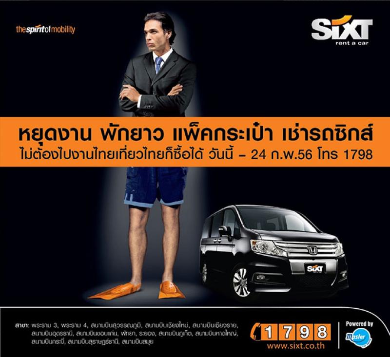ซิกส์ ( SixT rent a car ) รถเช่าแบรนด์ชั้นนำสำหรับการเช่ารถระยะสั้นและเป็นผู้ดูแลตลาดในอาเซียนได้ส่งแคมเปญสำหรับวันหยุดยาวพร้อมแพ็คกระเป๋า กับราคาเบาๆ สบาย เริ่มต้นราคาที่ 850 บาทต่อวันเท่านั้น สามารถพบกับ ซิกส์ (SixT rent a car) ได้ที่งานไทยเที่ยวไทย ครั้งที่ 27 ตั้งแต่วันที่ 21-24 ก.พ. 2556