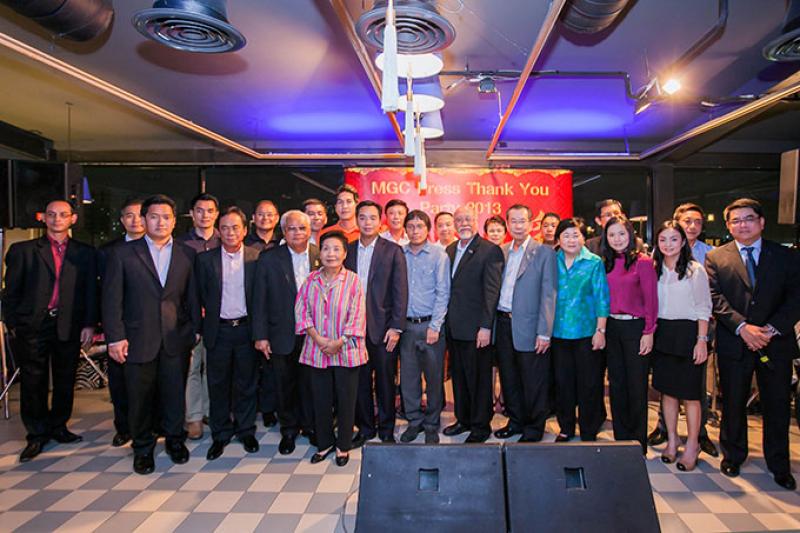 บริษัท มาสเตอร์กรุ๊ป คอร์เปอเรชั่น ( เอเชีย ) จำกัด หรือ เอ็มจีซี ได้จัดงาน “ MGC Press Thank You Party 2013” ที่ ชั้น 6 ร้าน FUZIO & The Garret (เอกมัย ซ.7) โดยมี ดร.สัณหวุฒิ ธรรมชวนวิริยะ กรรมการผู้จัดการ ( ที่ 5 จากซ้ายมือ ) , นางรัตนา ธรรมชวนวิริยะ รองประธานบริหารบริษัท มาสเตอร์ กรุ๊ป คอร์ปอเรชั่น (เอเชีย) จำกัด ( ที่ 4 จากซ้าย ) และผู้บริหารจากบริษัทในเครือ ทั้งนี้ยังได้รับเกียรติจาก นายพีระพงศ์ เอี่ยมลำเนา รองประธานกรรมการบริหารบริษัทกร…