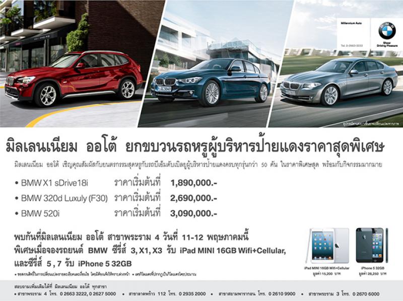มิลเลนเนียม ออโต้ จัดแคมเปญดับความร้อนให้ลูกค้าคนพิเศษ ด้วย “ BMW Executive Cars Day ” พบกับรถใหม่ป้ายแดงเลขไมล์น้อย พร้อมผ่านการรับรองมาตรฐานสูงสุดของ BMW Premium Selection มาให้คัดสรรเลือกหลากหลายรุ่นมากกว่า 50 คัน อาทิ BMW X1 ราคาเริ่มต้นที่ 1,890,000 บาท , BMW 320d Luxuly(F30) เริ่มต้นที่ 2,690,000 บาท และ BMW520iเริ่มต้นที่ 3,090,000 บาท เป็นต้น พร้อมโปรโมชั่นสุดพิเศษ เมื่อจองรถในงานรับฟรี Ipad MINI หรือ Iphone 5 สามารถเข้าสัมผัสความพิ…