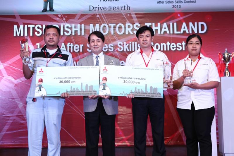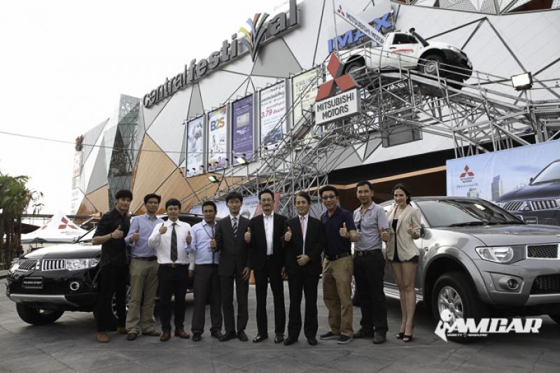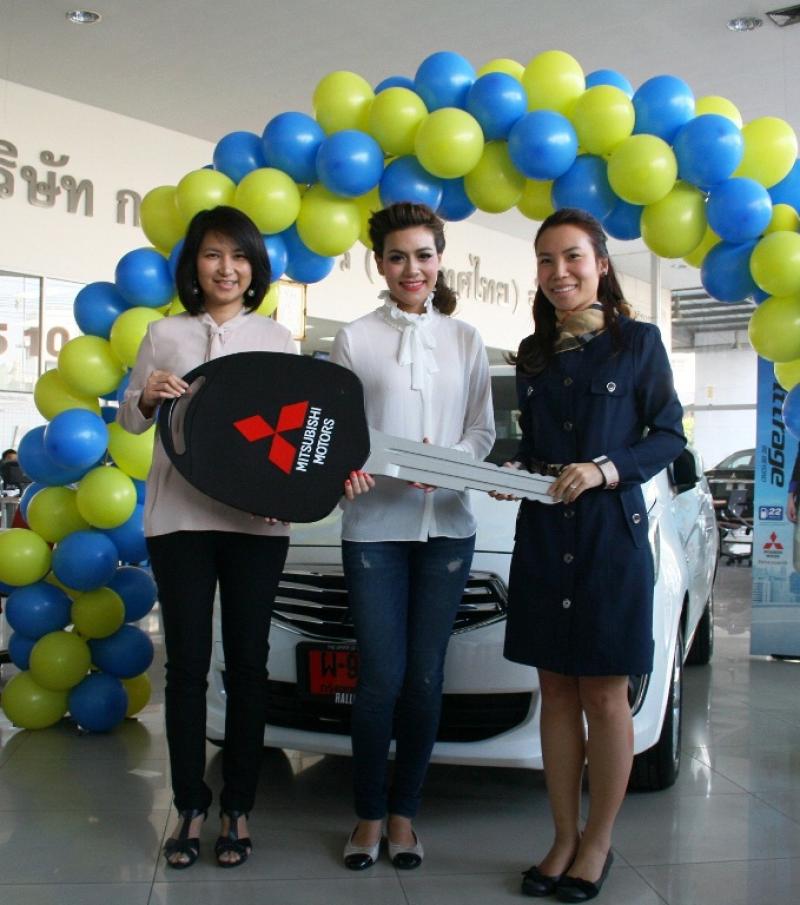 ผกามาศ ผดุงศิลป์ ผู้อำนวยการฝ่ายประชาสัมพันธ์ บริษัท มิตซูบิชิ มอเตอร์ส (ประเทศไทย) จำกัด (ที่1จากซ้าย) พร้อมด้วย พนมพร ฐิติปุญญา ผู้บริหาร บริษัท กฤษฎากลการ (ประเทศไทย) จำกัด (ที่1จากขวา) ร่วมแสดงความยินดีและส่งมอบรถยนต์มิตซูบิชิ แอททราจรุ่น GLS Ltd. ให้กับ “คิมเบอร์ลี่ แอน เทียมสิริ” พรีเซ็นเตอร์ รถยนต์มิตซูบิชิ แอททราจ