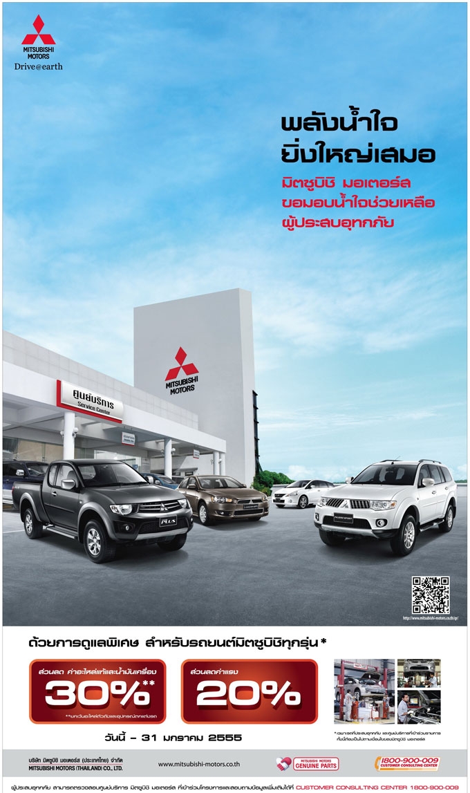 มิตซูบิชิ มอเตอร์ส ประเทศไทย ส่งทีมช่างร่วมช่วยเหลือและฟื้นฟูผู้ประสบภัย พร้อมจัดทำสื่อออนไลน์ให้ความรู้เรื่องการดูแลรักษารถหลังน้ำลด รวมทั้งเร่งเดินหน้ายกระดับการดำเนินงานบริการหลังการขายรองรับตลาดโต