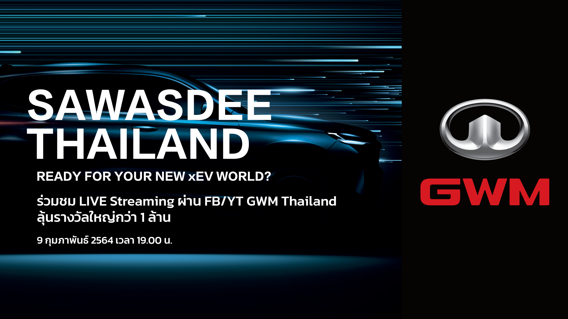 เกรท วอลล์ มอเตอร์ บริษัทที่ให้บริการการขับเคลื่อนด้วยเทคโนโลยีระดับโลก (Global Mobility Technology Company) จัด Livestreaming แถลงข่าวเปิดตัวแบรนด์อย่างเป็นทางการครั้งแรกในเมืองไทย ภายใต้แนวคิด “Sawasdee Thailand – Experience Your New xEV World” ผ่านทาง Facebook และ YouTube GWM Thailand