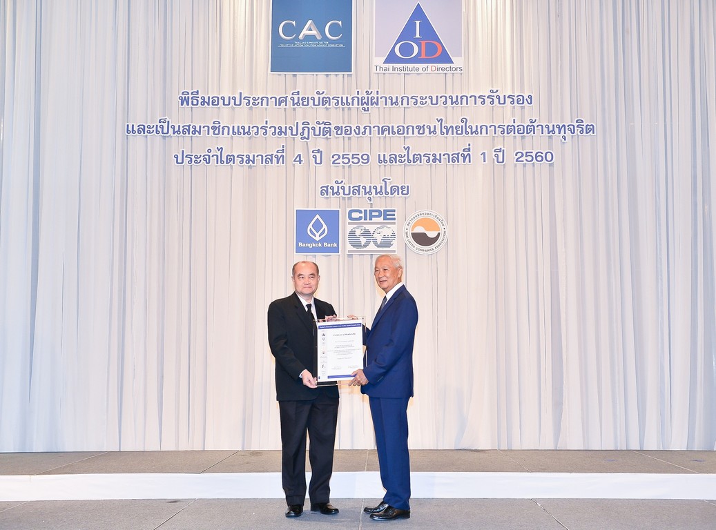 โดยผู้บริหารบริษัทฯ เข้ารับมอบประกาศนียบัตรโครงการฯ ในฐานะสมาชิกแนวร่วมปฏิบัติของภาคเอกชนไทยในการต่อต้านทุจริต ที่โรงแรมเรอเนสซองซ์ กรุงเทพ เมื่อวันที่ 28 มิถุนายนที่ผ่านมา