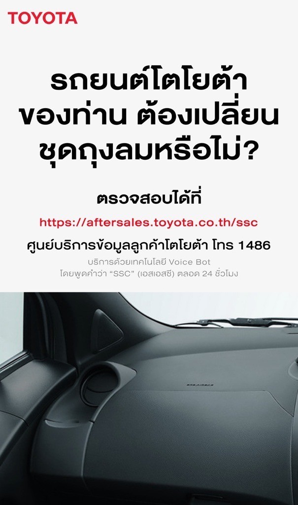 • ศูนย์บริการข้อมูลลูกค้าโตโยต้า โทร 1486 บริการด้วยเทคโนโลยี Voice Bot โดยพูดคำว่า “SSC” (เอสเอสซี) ตลอด 24 ชั่วโมง