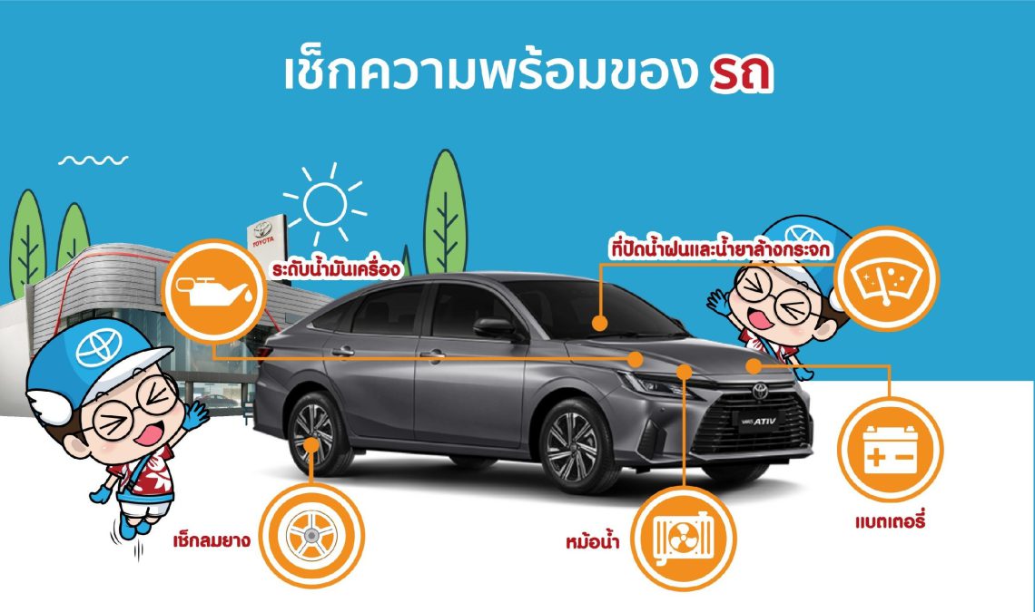 บริษัทฯ มีความตั้งใจในการรณรงค์ความปลอดภัยบนท้องถนน ผ่านการเน้นย้ำให้ผู้ใช้รถใช้ถนนตระหนักถึงเรื่อง “ความเร็ว” ด้วยการขับขี่โดยใช้ความเร็วตามที่กฎหมายกำหนด รวมถึงร่วมแบ่งปันวินัยและน้ำใจให้กับเพื่อนร่วมทาง เพื่อช่วยลดอัตราการเกิดอุบัติเหตุในช่วงเทศกาล และเพื่อเป็นการสร้างความมั่นใจให้การเดินทางท่องเที่ยวเป็นไปอย่างปลอดภัยตลอดเส้นทาง บริษัทฯ พร้อมด้วยผู้แทนจำหน่ายโตโยต้าทั่วประเทศ จึงจัดให้มีบริการตรวจเช็กสภาพรถยนต์ฟรี 24 รายการ ในช่วงเทศกาลท่องเที่ยวสงกรานต์ เพื่อเป็นการเตรียมความพร้อมรถยนต์ให้อยู่ในสภาพสมบูรณ์ และป้องกันการเกิดอุบัติเหตุ ซึ่งผู้ที่สนใจสามารถนำรถยนต์ไปตรวจเช็กได้ตั้งแต่วันที่ 1-30 เมษายน 2566 โดยมีรายการตรวจเช็ก 24 รายการ ดังนี้