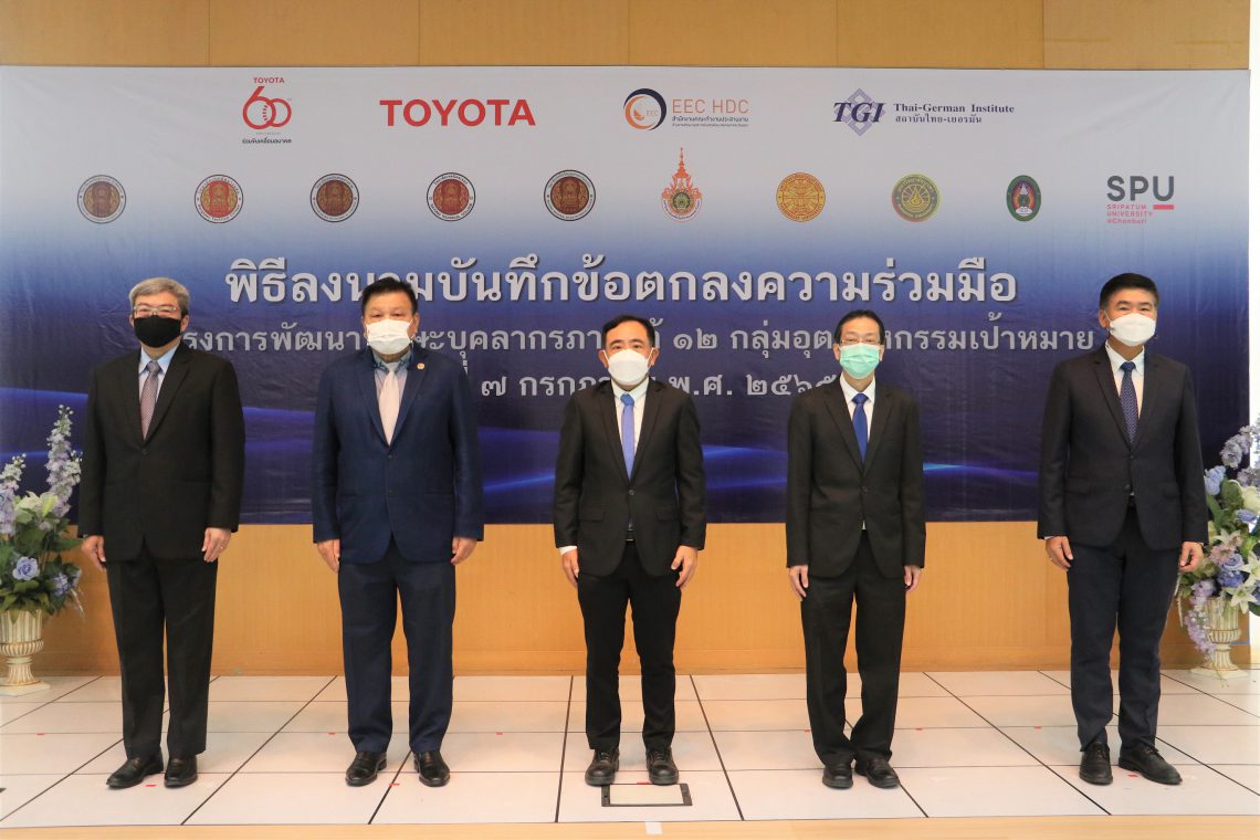 โครงการ “การพัฒนาทักษะบุคลากรภายใต้ 12 กลุ่มอุตสาหกรรมเป้าหมาย” เป็นความร่วมมือกันระหว่าง บริษัท โตโยต้า มอเตอร์ ประเทศไทย จำกัด สถาบันไทย – เยอรมัน พร้อมด้วย มหาวิทยาลัย และวิทยาลัยเทคนิคชั้นนำ 10 แห่ง ในเขตพัฒนาพิเศษภาคตะวันออก และถือเป็นการดำเนินงานภายใต้นโยบายของสำนักงานคณะกรรมการนโยบายเขตพัฒนาพิเศษภาคตะวันออก โดยเป้าหมายของความร่วมมือในครั้งนี้ ทางโตโยต้ามุ่งหวังที่จะนำเอาองค์ความรู้ในด้านเทคโนโลยียานยนต์ การผลิต และการบริหารจัดการเพื่อเพิ่มประสิทธิภาพการผลิต มาถ่ายทอดให้แก่บรรดา นักเรียน นักศึกษา และบุคลากรต่างๆ ในเขตพัฒนาพิเศษภาคตะวันออก (EEC) เพื่อพัฒนาองค์ความรู้ ทักษะ และเตรียมความพร้อมให้มีศักยภาพตรงกับความต้องการของผู้ประกอบการใน 12 กลุ่มอุตสาหกรรมเป้าหมาย ตลอดจนแลกเปลี่ยนข้อมูลและศึกษาความเป็นไปได้ในการต่อยอดพัฒนาเนื้อหาหลักสูตรเพื่อเพิ่มพูนองค์ความรู้และทักษะที่จำเป็นอื่นๆ จากประสบการณ์ตรงของบุคลากรภายในบริษัท โตโยต้า มอเตอร์ ประเทศไทย จำกัด ให้แก่บรรดาบุคลากรเหล่านี้ต่อไปในอนาคตอีกด้วย