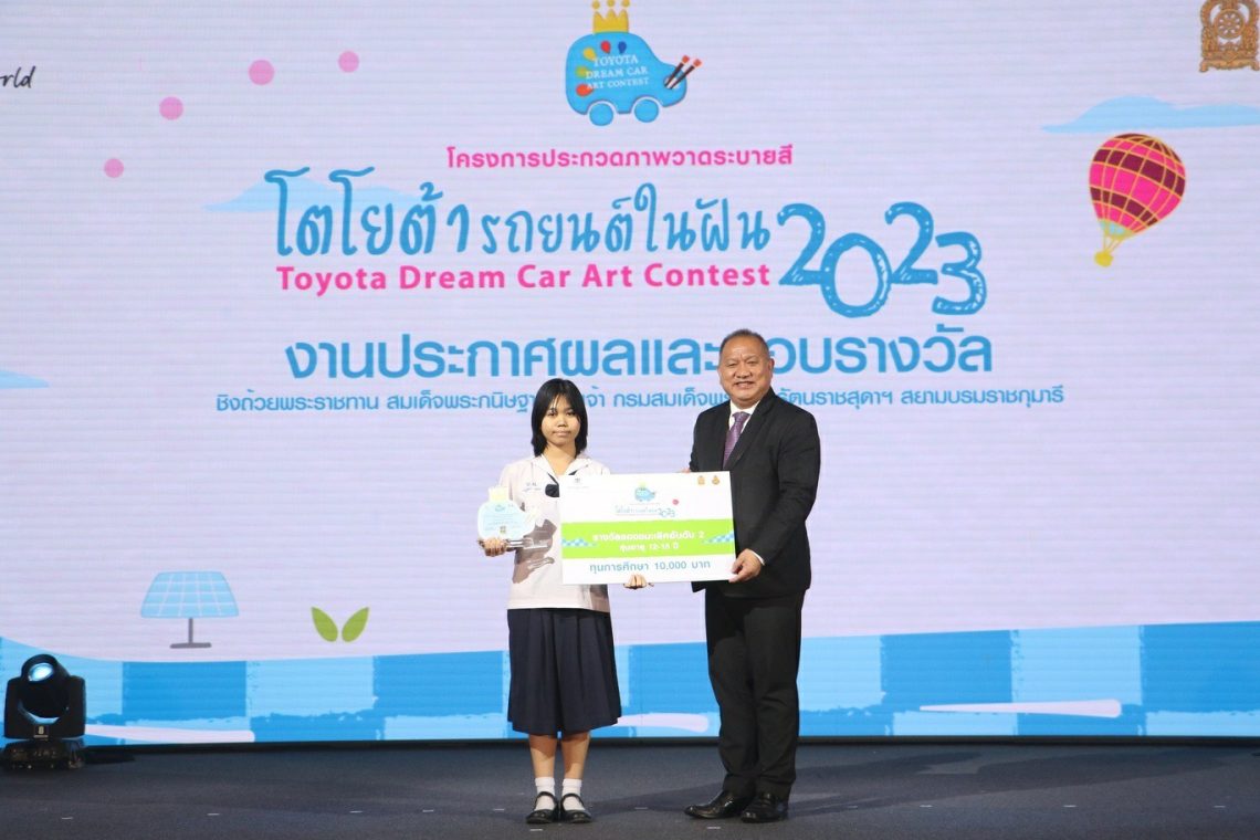 และนับเป็นพระมหากรุณาธิคุณเป็นล้นพ้นอันหาที่สุดมิได้แก่โครงการฯ และเยาวชนไทย ที่ได้รับพระราชทานพระวโรกาสจาก สมเด็จพระกนิษฐาธิราชเจ้า กรมสมเด็จพระเทพรัตนราชสุดา เจ้าฟ้ามหาจักรีสิรินธรฯ สยามบรมราชกุมารี ทรงพระราชทานถ้วยรางวัลแก่ผู้ชนะการประกวด TOYOTA Dream Car Art Contest 2023 ในระดับประเทศ สำหรับเยาวชนที่ได้รับรางวัลยอดเยี่ยมอันดับ 1 ของทั้ง 3 รุ่น ตลอดจนโครงการฯ จะมอบทุนการศึกษา พร้อมโล่ประกาศเกียรติคุณให้กับเยาวชนที่ได้รับรางวัลยอดเยี่ยมอีกด้วย
