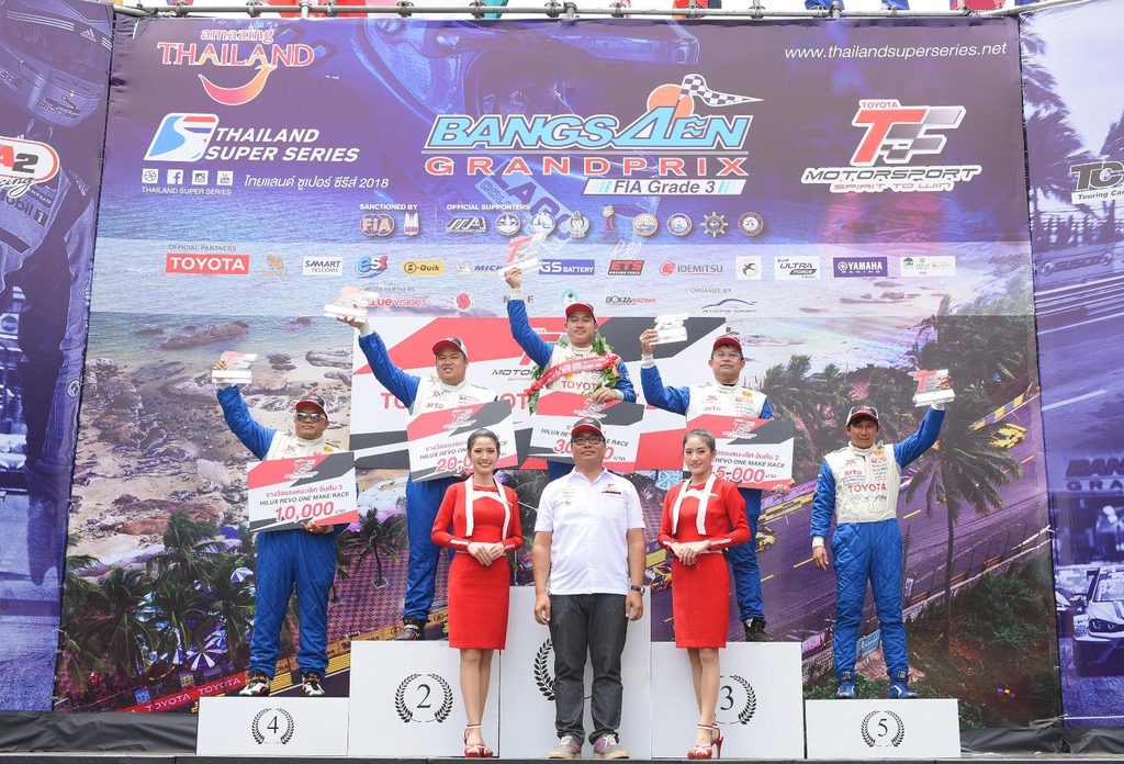 ในขณะที่การแข่งขันรถกระบะทางเรียบ “ไฮลักซ์ รีโว่ วันเมคเรซ” กับเครื่องยนต์ 2,400 ซีซี กระบะสายพันธุ์แกร่ง ช่วงล่างหนึบ สมรรถนะแรงสุดขีด มีรถลงแข่งขันทั้งสิ้น 14 คัน กับ 8 รอบ โดย “ชินวุฒิ เหล่าชินชาติ ” คว้าอันดับที่ 1 ตามมาด้วย “ชยพล โยธา” จากทีม “Morseng Racing Team” ในอันดับที่ 2 และ “กัมปนาท แก้วถังเมือง” คว้าอันดับที่ 3